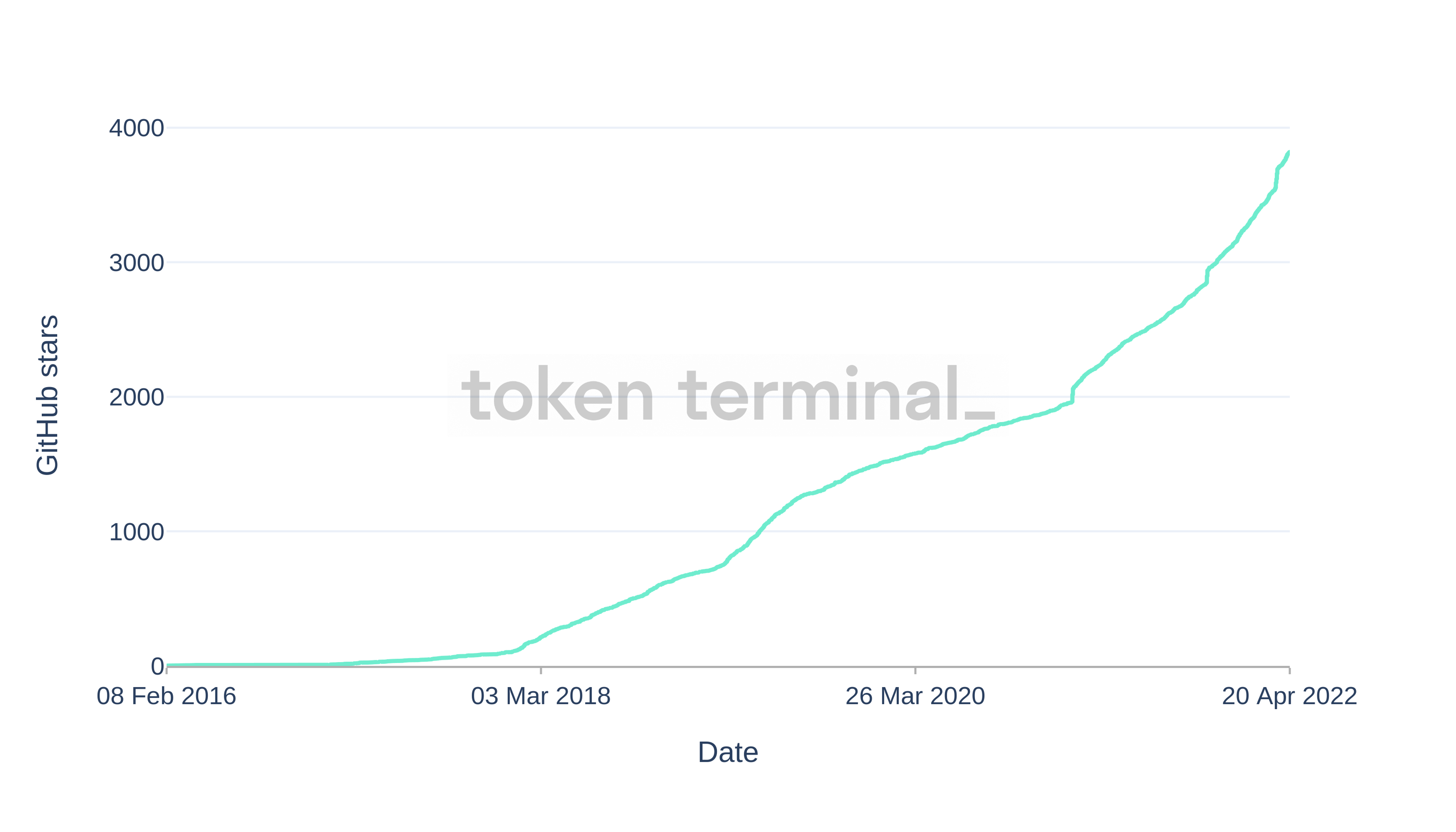 Ultimately, the value of the Cosmos ecosystem will depend on all blockchains in the network. Therefore, overall developer interest in Cosmos’ tools is crucial. In order to get a rough estimate of developer interest in the ecosystem, we can use the number of times Cosmos SDK has been starred (i.e., bookmarked) on GitHub, shown in the figure below. Developer interest started to grow significantly faster in March 2018 and seems to further have accelerated in February 2021.