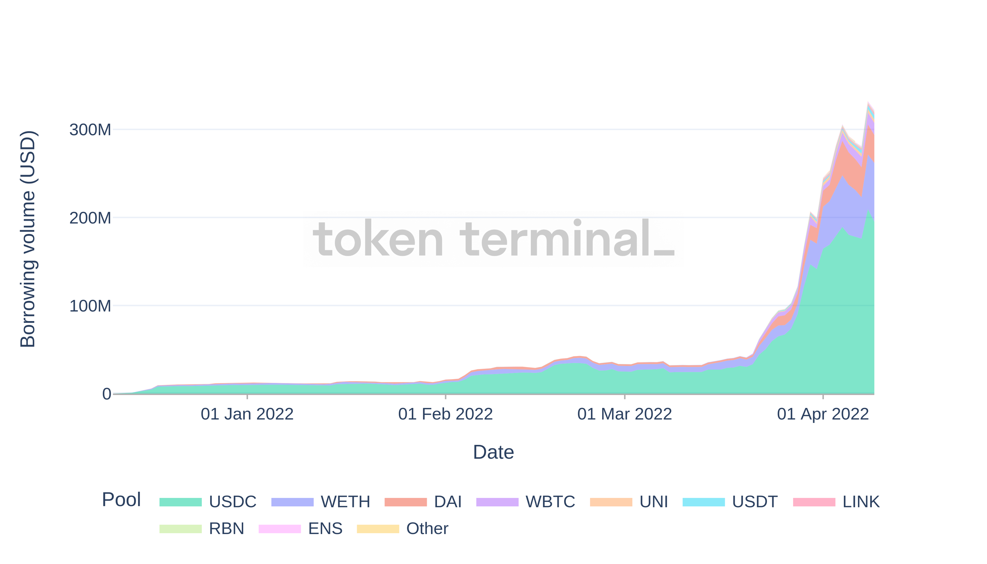 Since Euler is a lending protocol, let’s start by looking at the total borrowing volume, i.e., the value of outstanding loans. The figure below shows the historical borrowing volume since the launch of the protocol. After three months of consistent growth, Euler’s borrowing volume reached 50 million USD on the 22nd of March 2022, and in the following two weeks, the protocol’s borrowing volume grew six-fold, reaching 300 million USD on the 5th of April 2022.