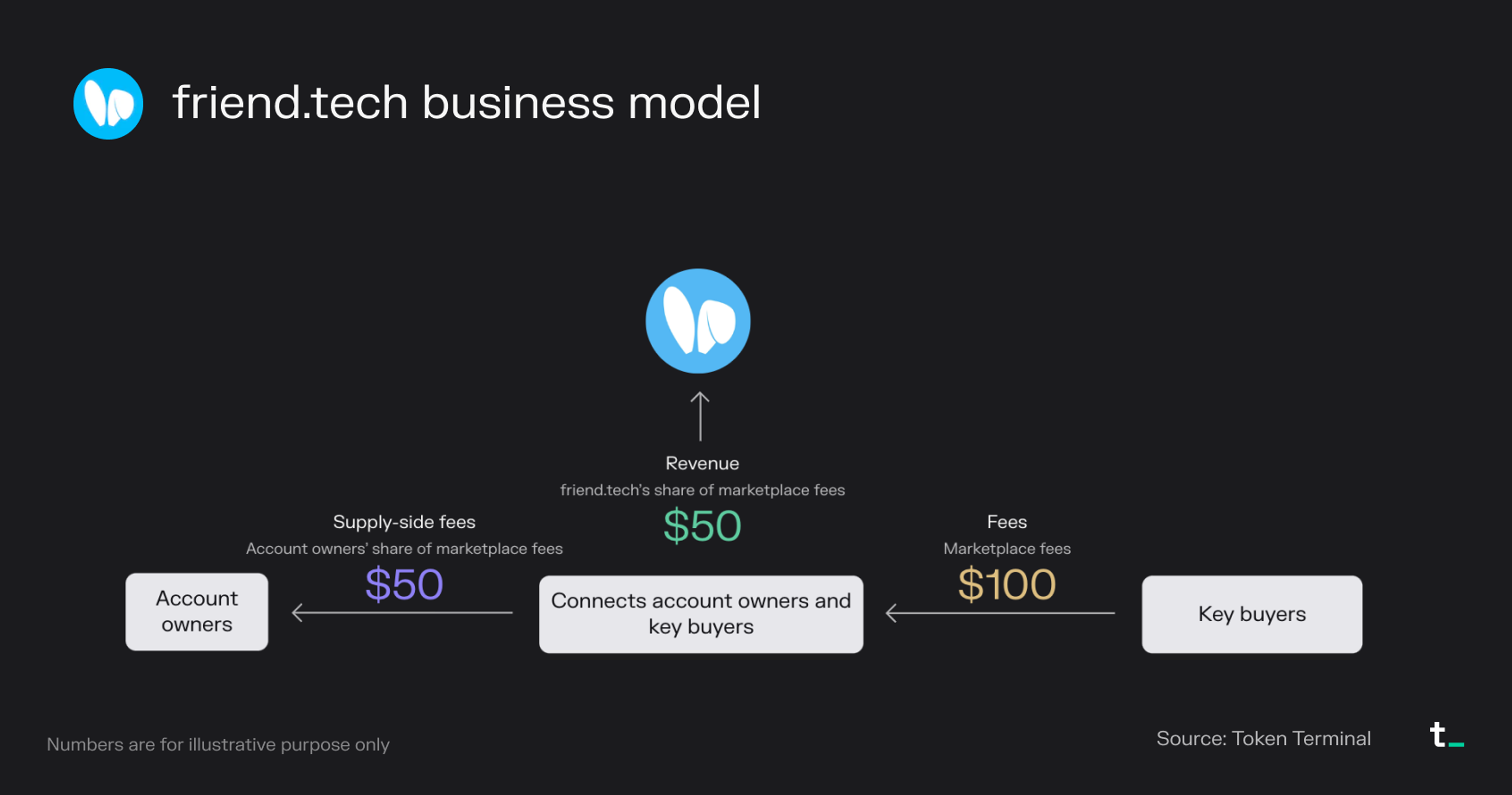 The business model for friend.tech is to take a 50% cut of the marketplace fees paid by key buyers (revenue), while the remaining amount goes to account owners (supply-side fees). The marketplace fees are 10% of the traded volume, such that if a user buys a key worth 1 ETH, the buyer will need to pay an additional 0.1 ETH in marketplace fees. This revenue stream is particularly attractive because it is automated via a smart contract, and does not require resources from the team to scale.