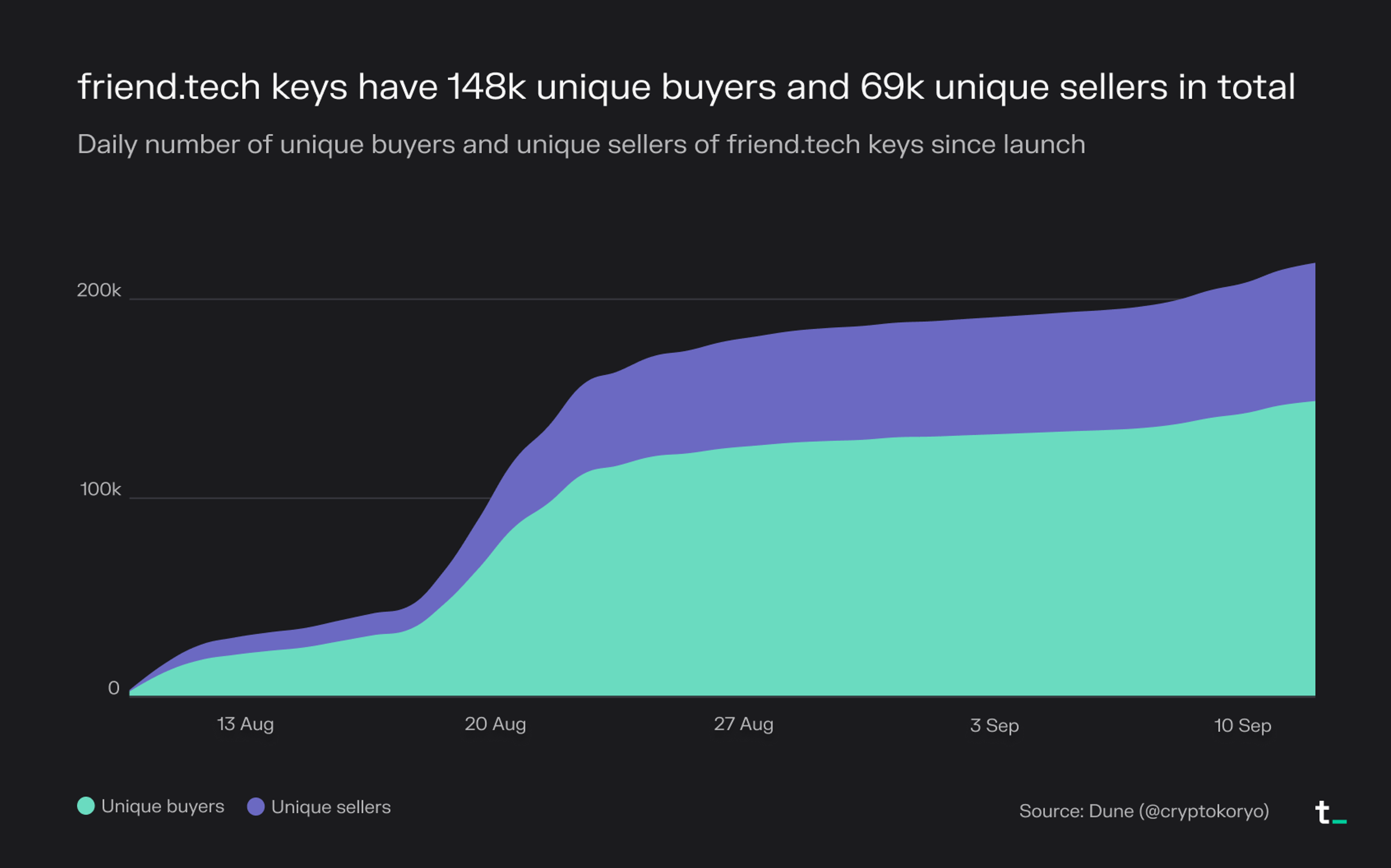 Figure 11: Cumulative unique buyers and sellers of friend.tech keys since launch [19]