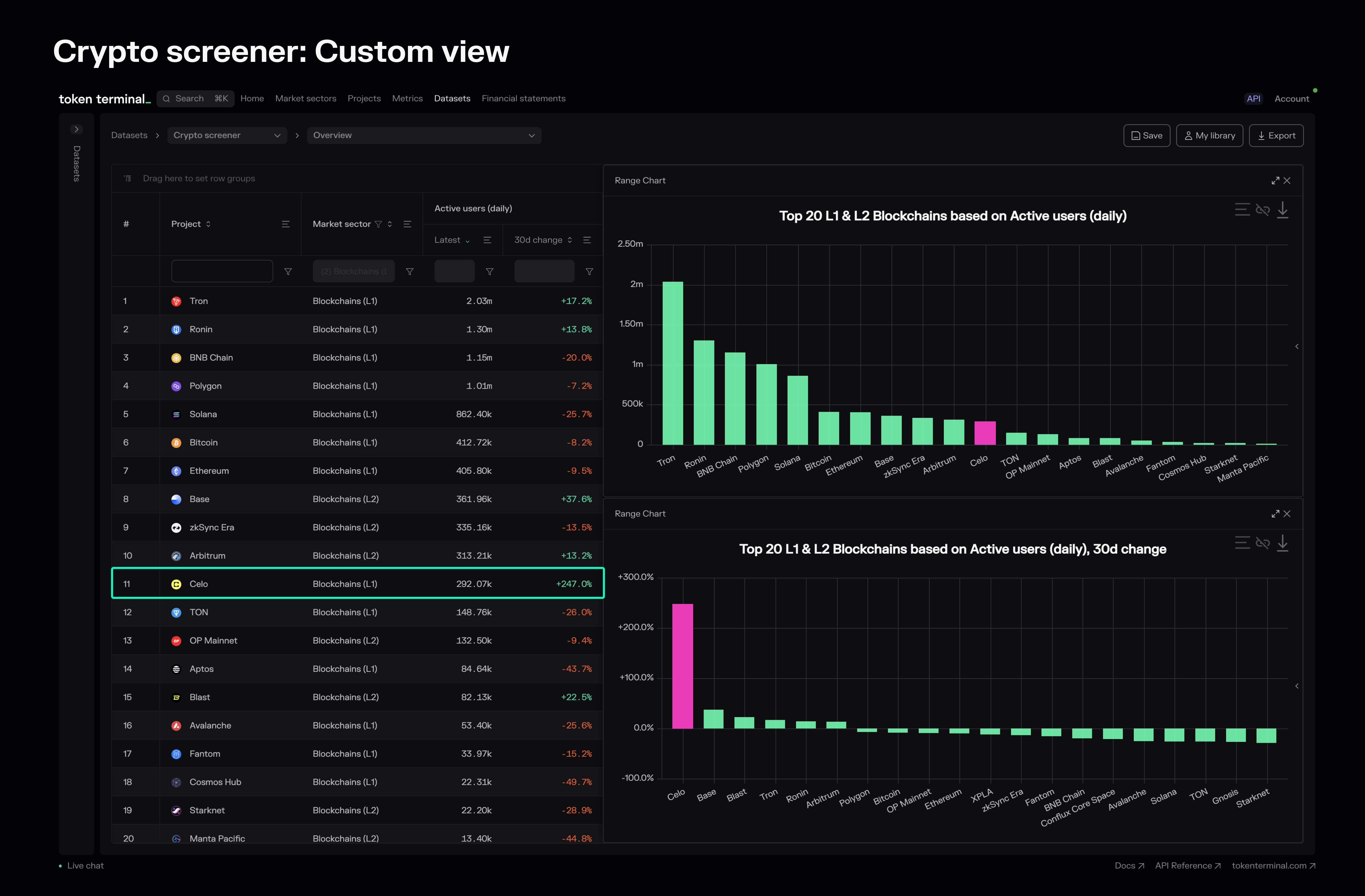 - Token Terminal’s unique fullstack operating model allows us to serve Celo’s standardized onchain datasets to the world’s premier financial data companies and investment firms.