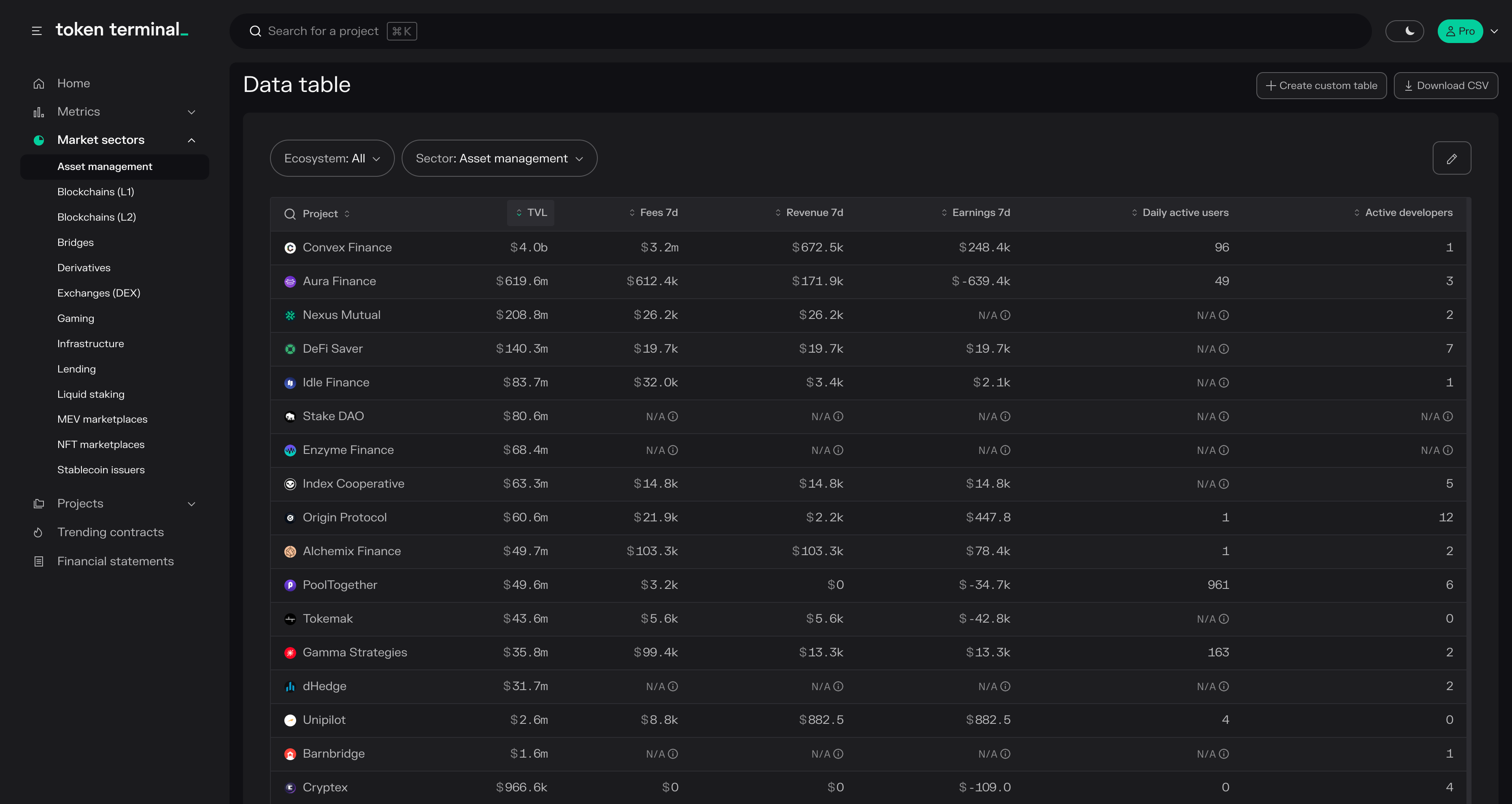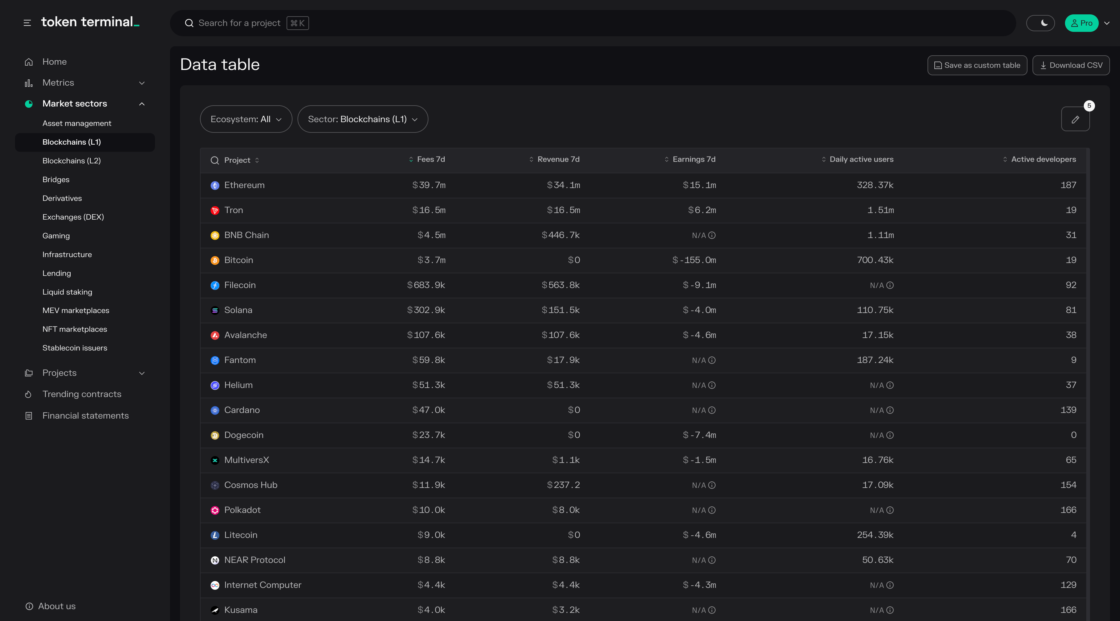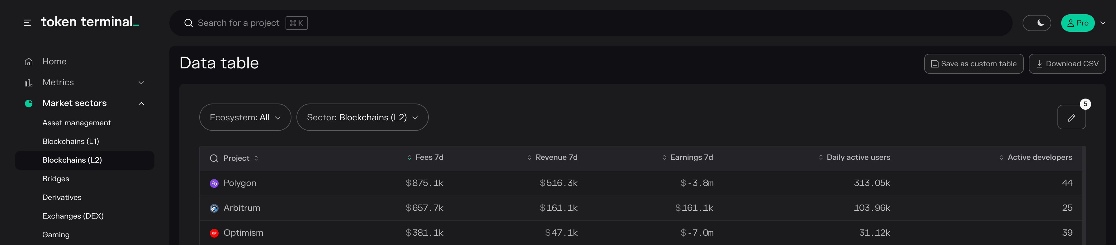 - Projects: project-specific market, usage, financial, valuation, and developer data available in both aggregate and composition format.