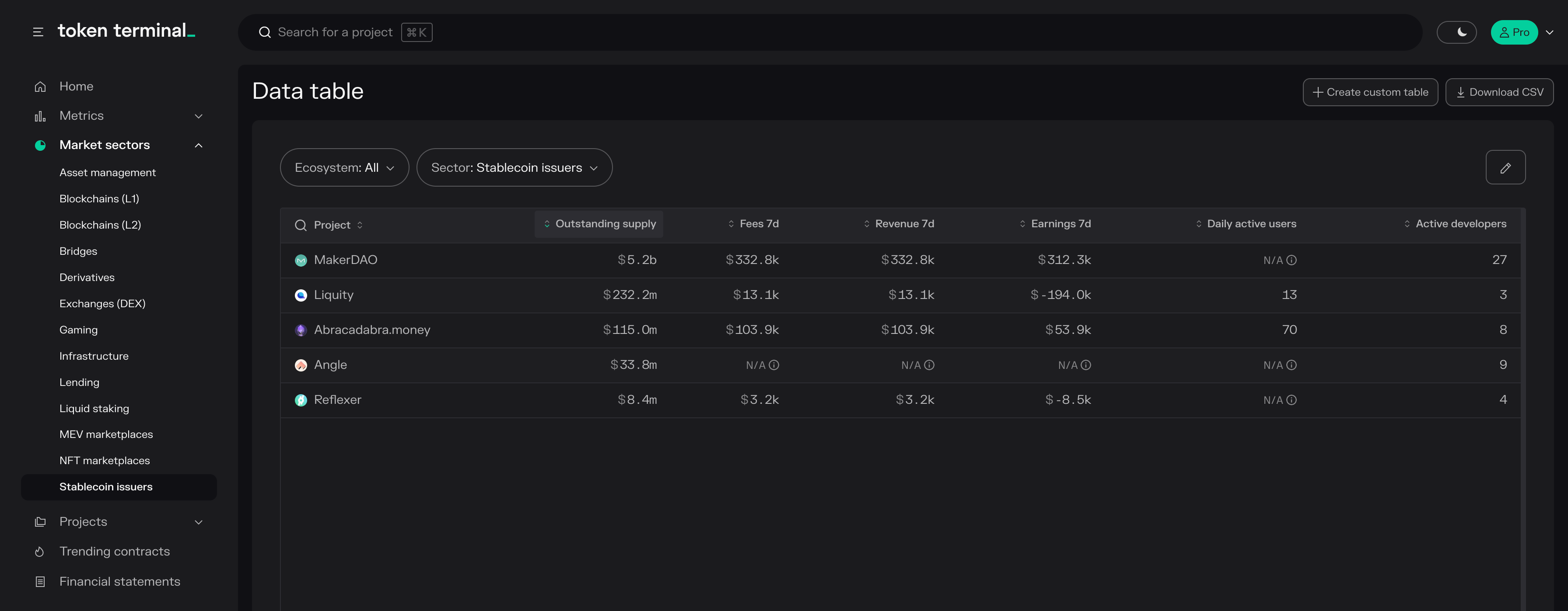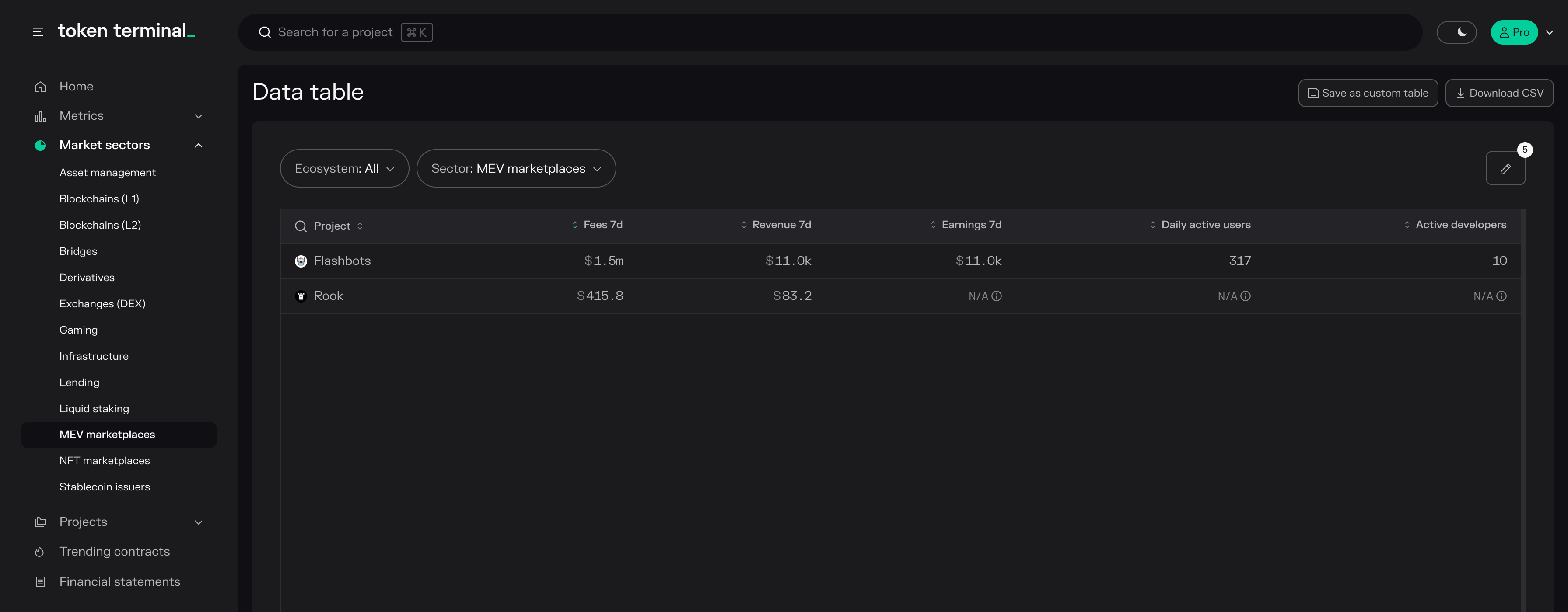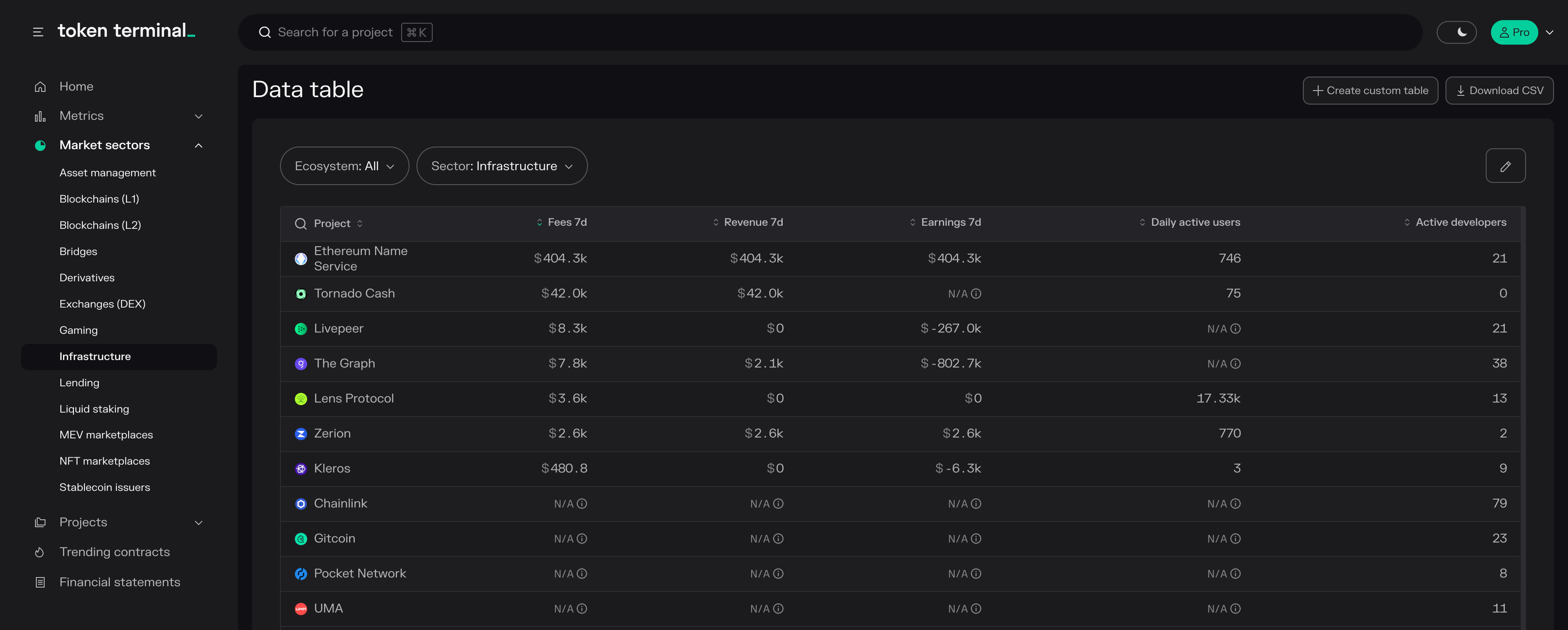 - Projects: project-specific market, usage, financial, valuation, and developer data available in both aggregate and composition format.