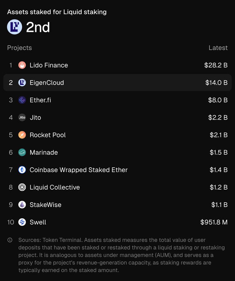 EigenCloud is now (i) listed on Token Terminal's liquid staking market sector dashboard and (ii) featured on the Discover page.