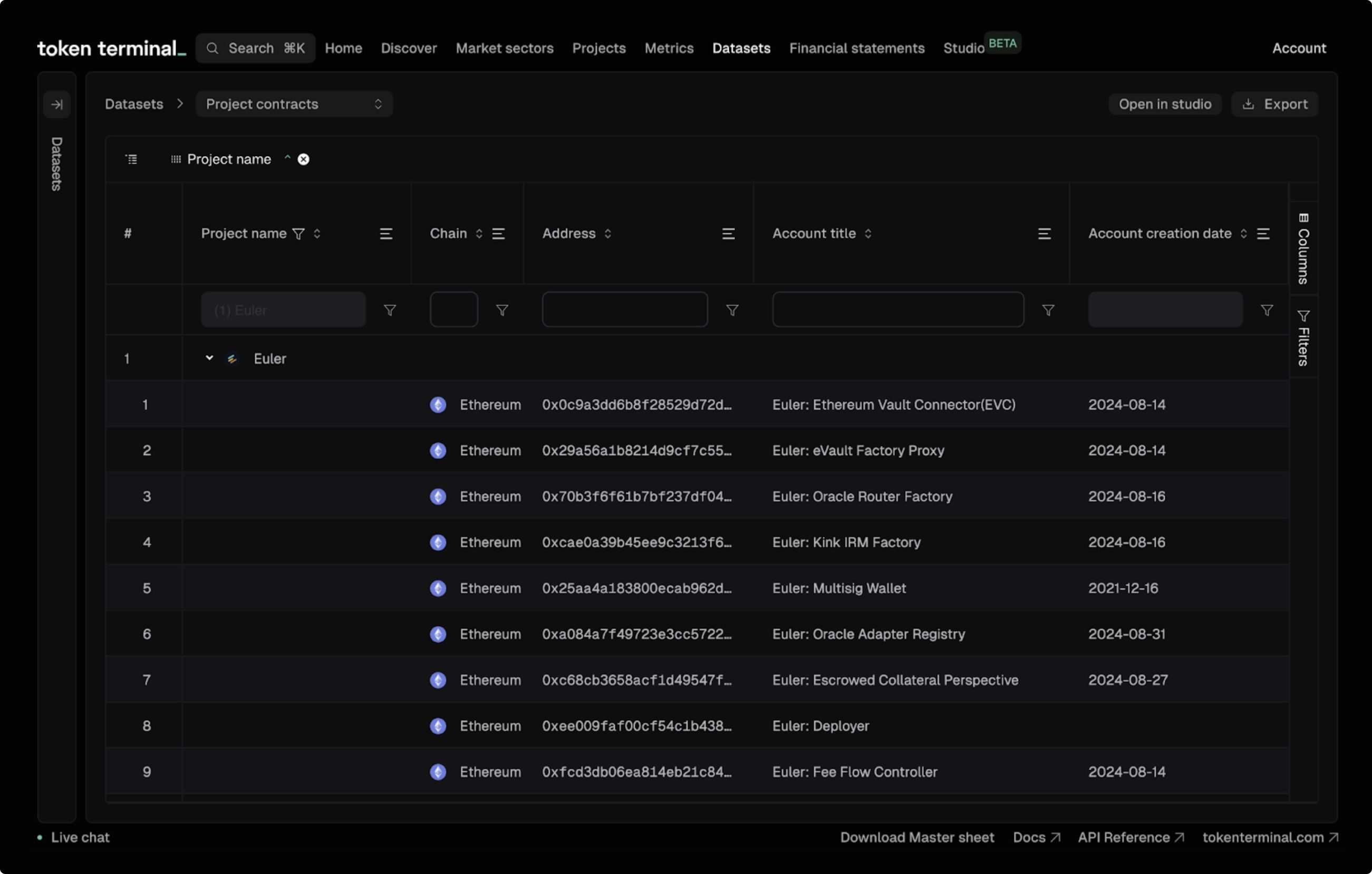 Token Terminal did not need new node infrastructure to work with Euler since Euler operates on Ethereum as a set of smart contracts. Token Terminal utilized its existing Ethereum node setup to start the process, where the teams jointly created a labeled registry of Euler’s smart contracts.