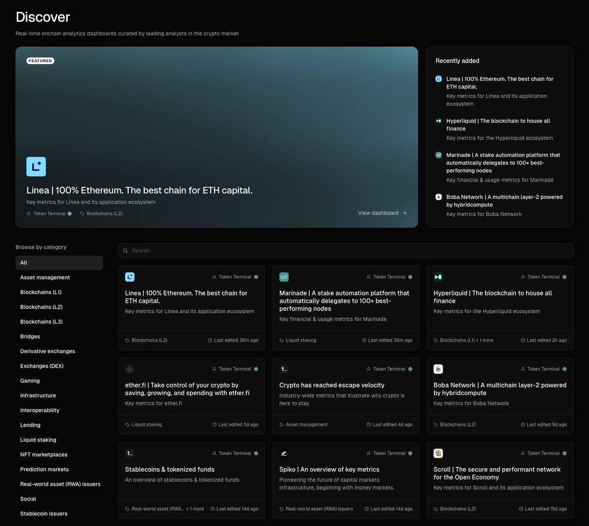 Once Token Terminal’s research team had calculated both the L2-specific and the application-layer metrics, Linea was listed on the L2 blockchain market sector dashboard, and its ecosystem dashboard was featured on the Discover page.