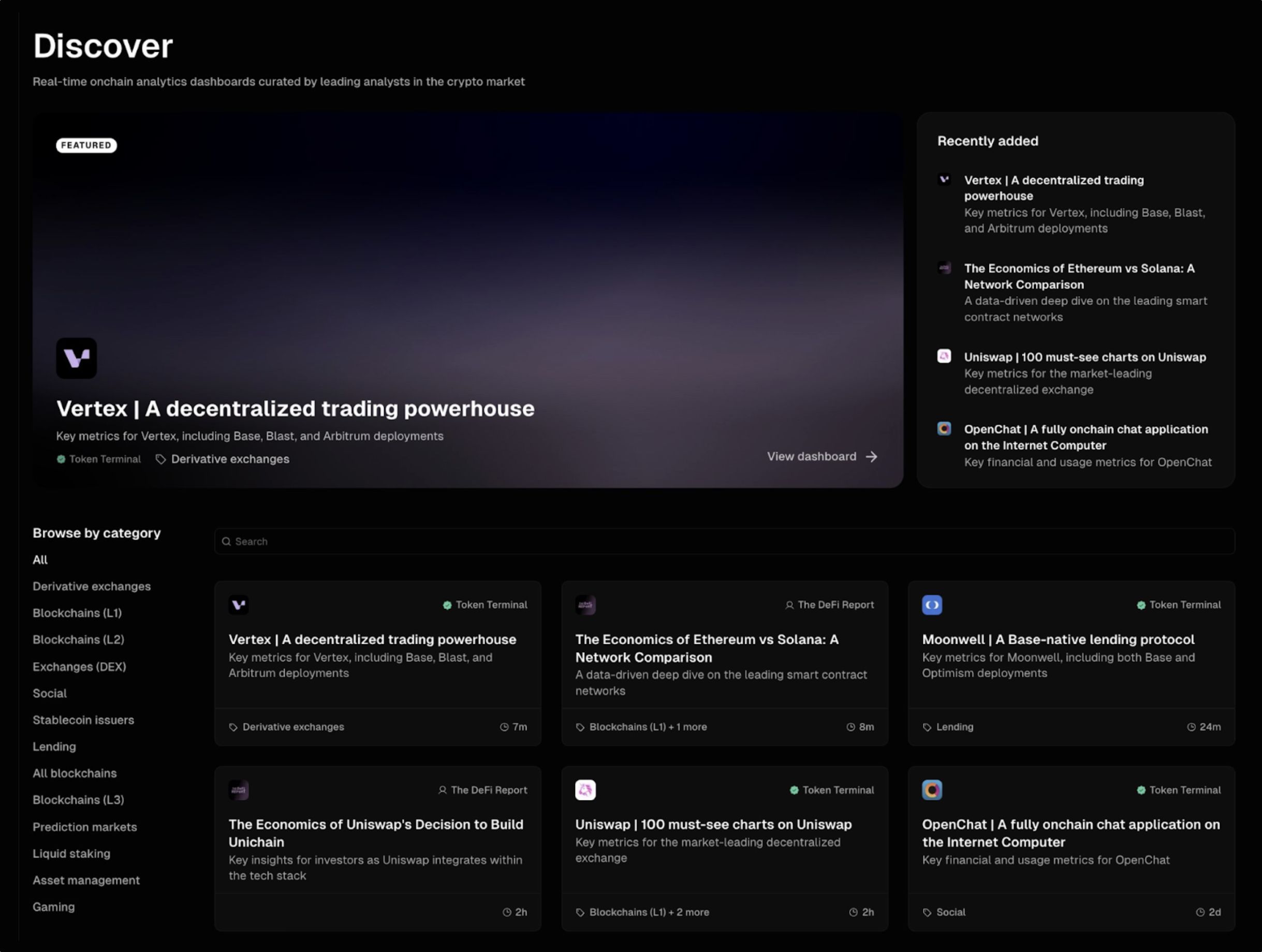 After the metric transformations, Vertex was listed on the derivative exchanges market sector dashboard on Token Terminal, and also featured on the recently launched Discover page. As a result, users, developers, and investors can now refer to a single source when deciding which protocols to use, integrate with, and/or invest in.