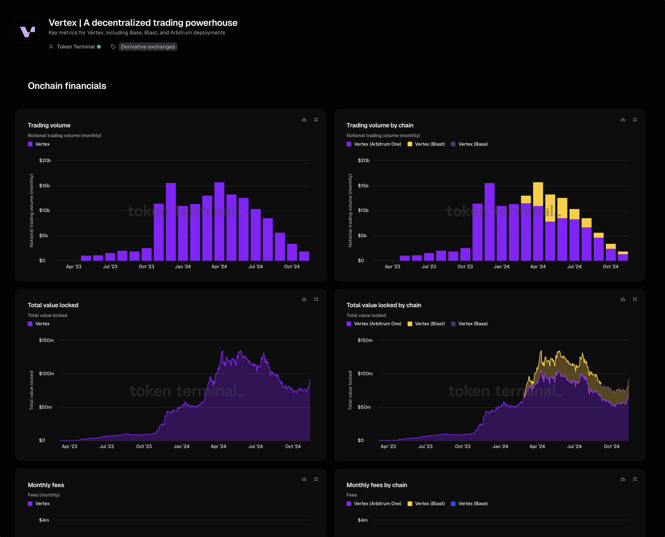 “By partnering with Token Terminal, we’re able to benchmark our performance against the competition in a fair and accurate way. Having a real-time dashboard on Token Terminal is not only a great tool for our team, but for all Vertex stakeholders.”