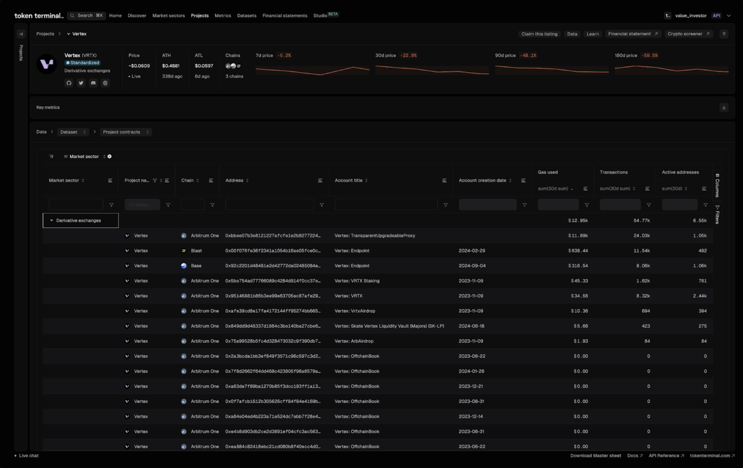 To start, the Vertex and Token Terminal teams worked together to build a labelled registry of Vertex’s smart contracts across chains.