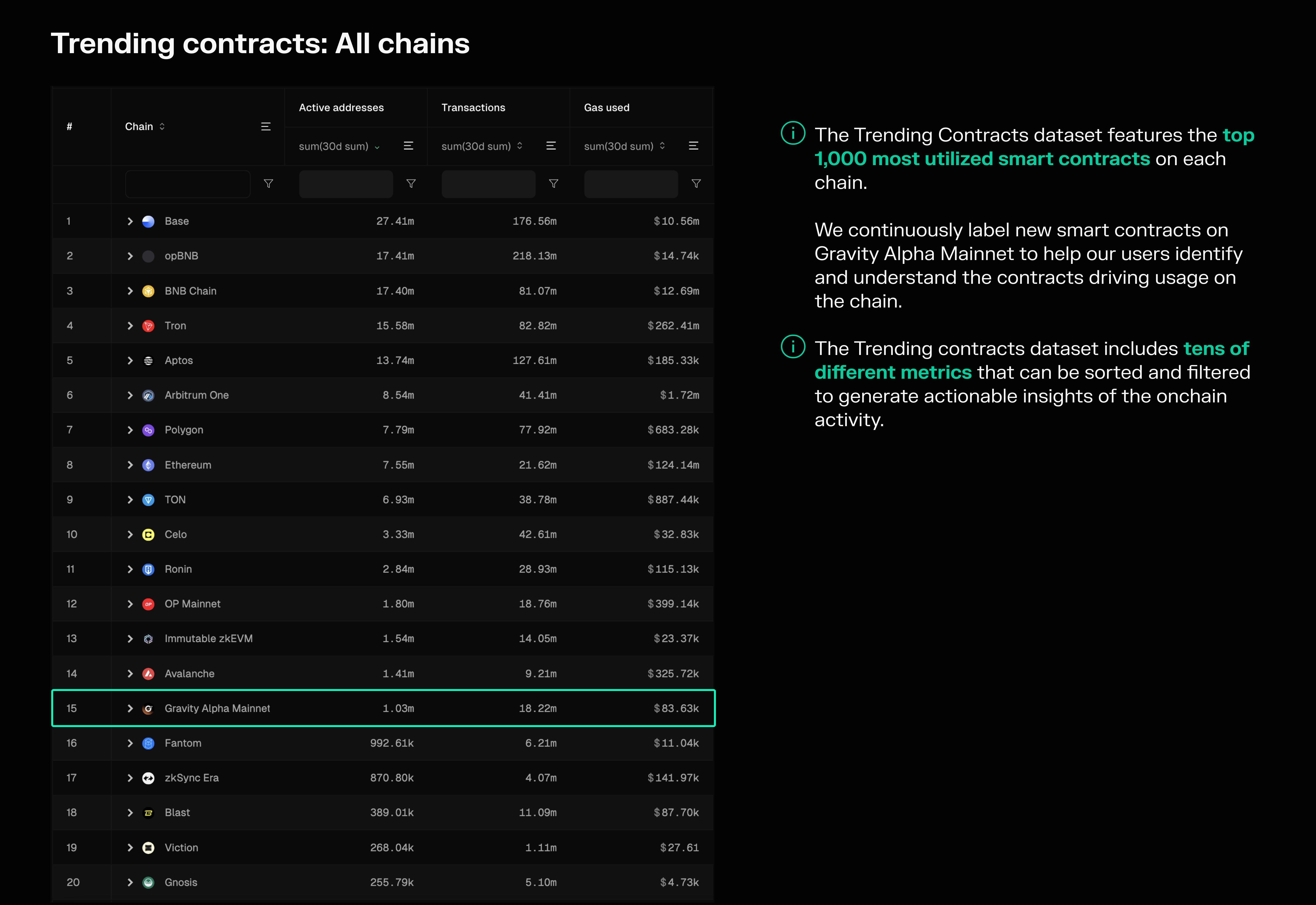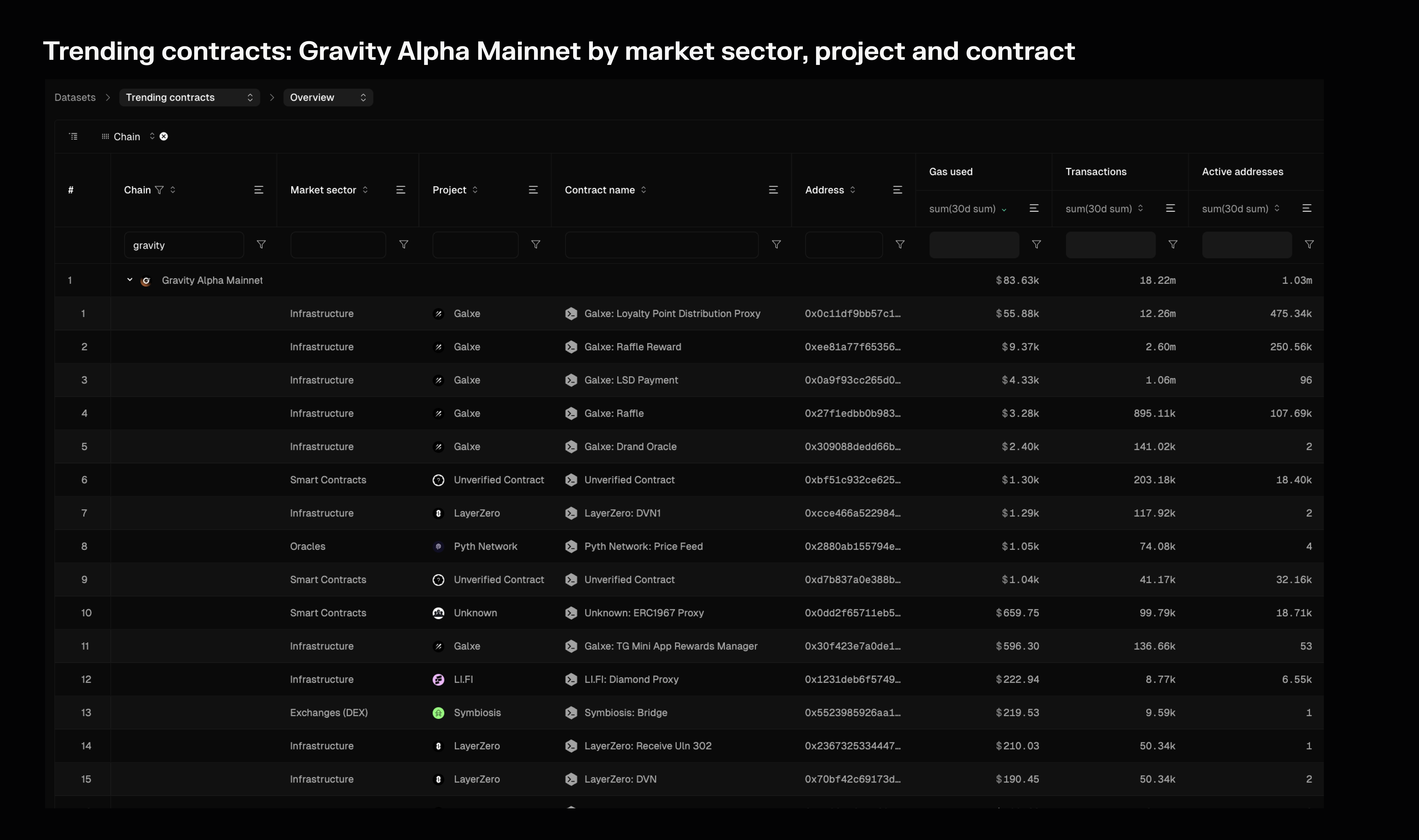 - Further, we enable analysts to understand which market sectors, projects, and contracts that drive usage on Gravity Alpha Mainnet.