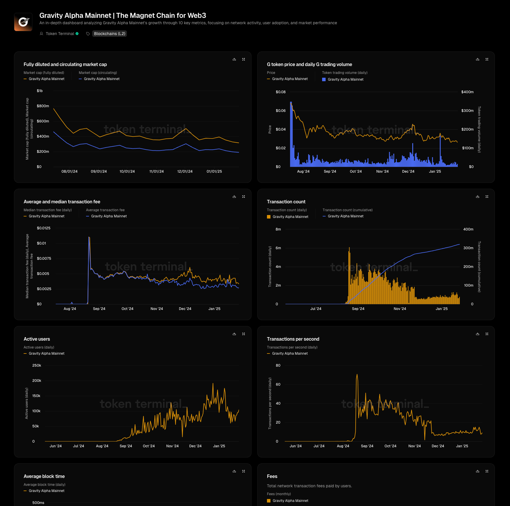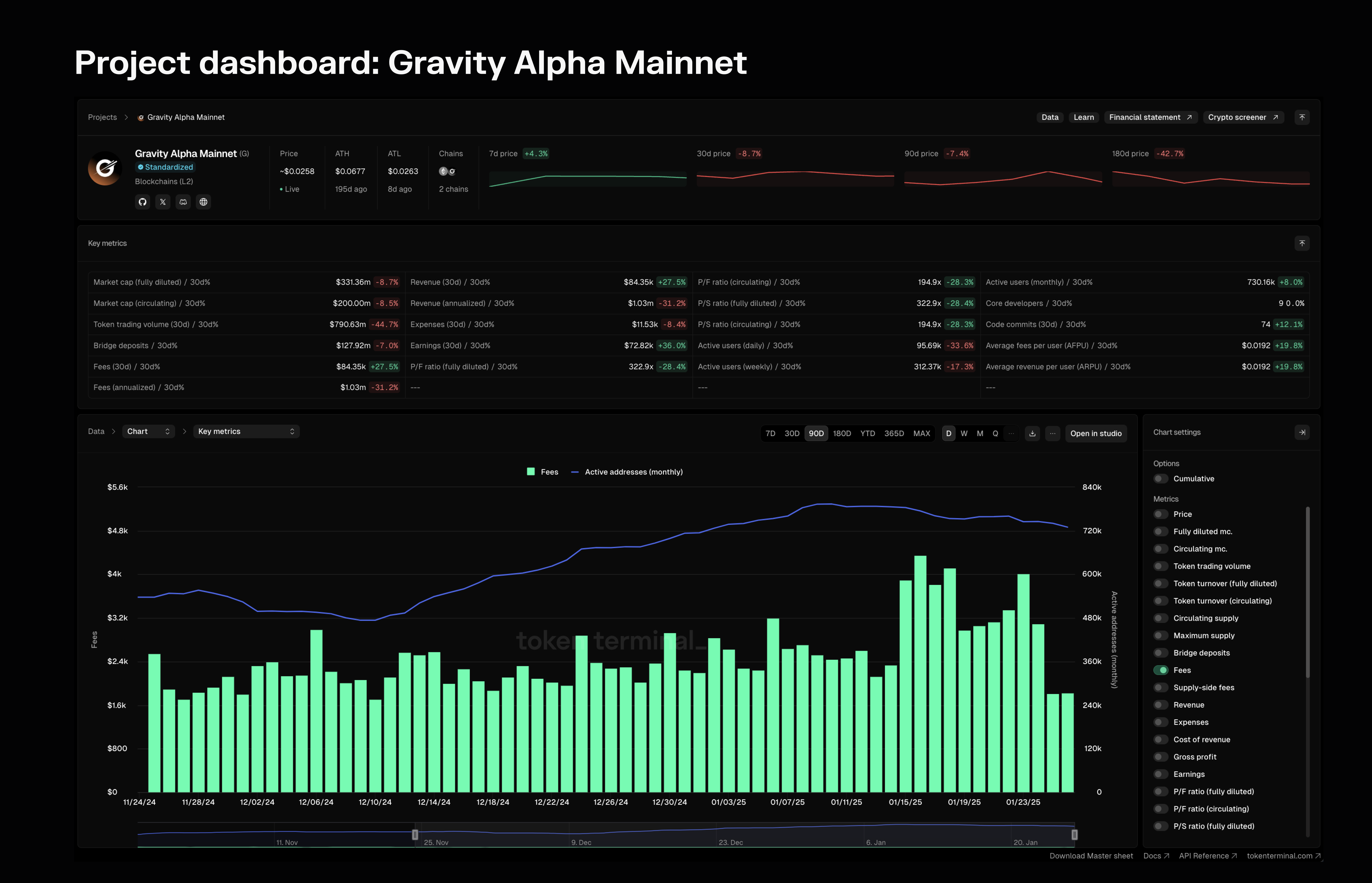 Token Terminal has completed its integration of Gravity Alpha Mainnet to enable institutional-grade onchain analytics for the Gravity Alpha Mainnet ecosystem. This integration improves the accessibility of Gravity Alpha Mainnet's onchain data to enable more informed decision-making for all stakeholders in the ecosystem.