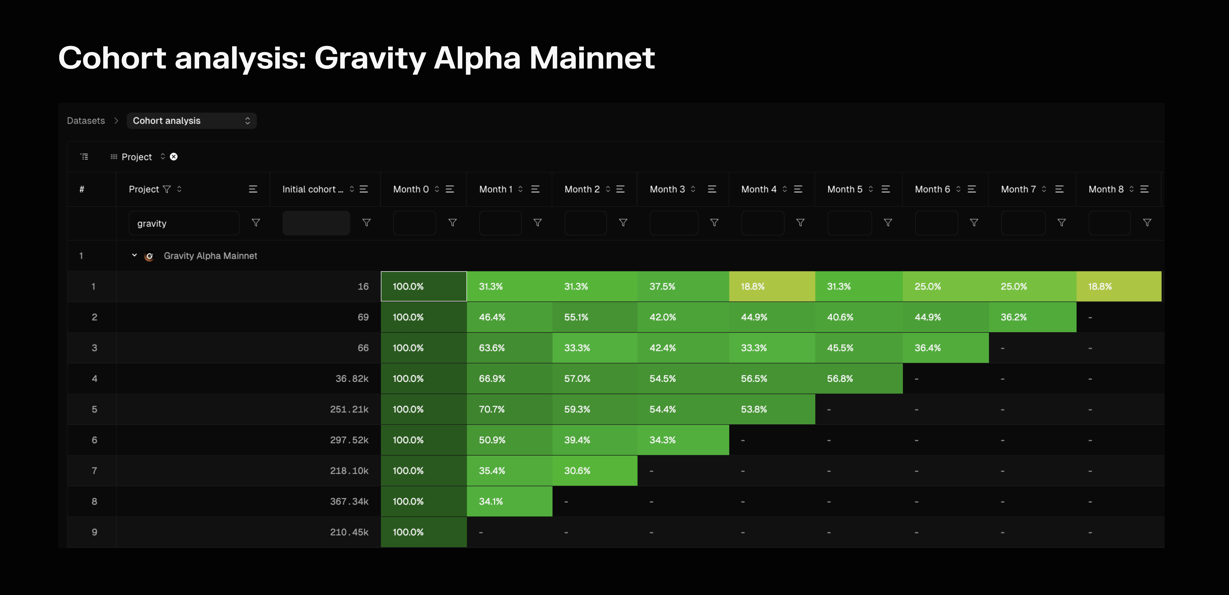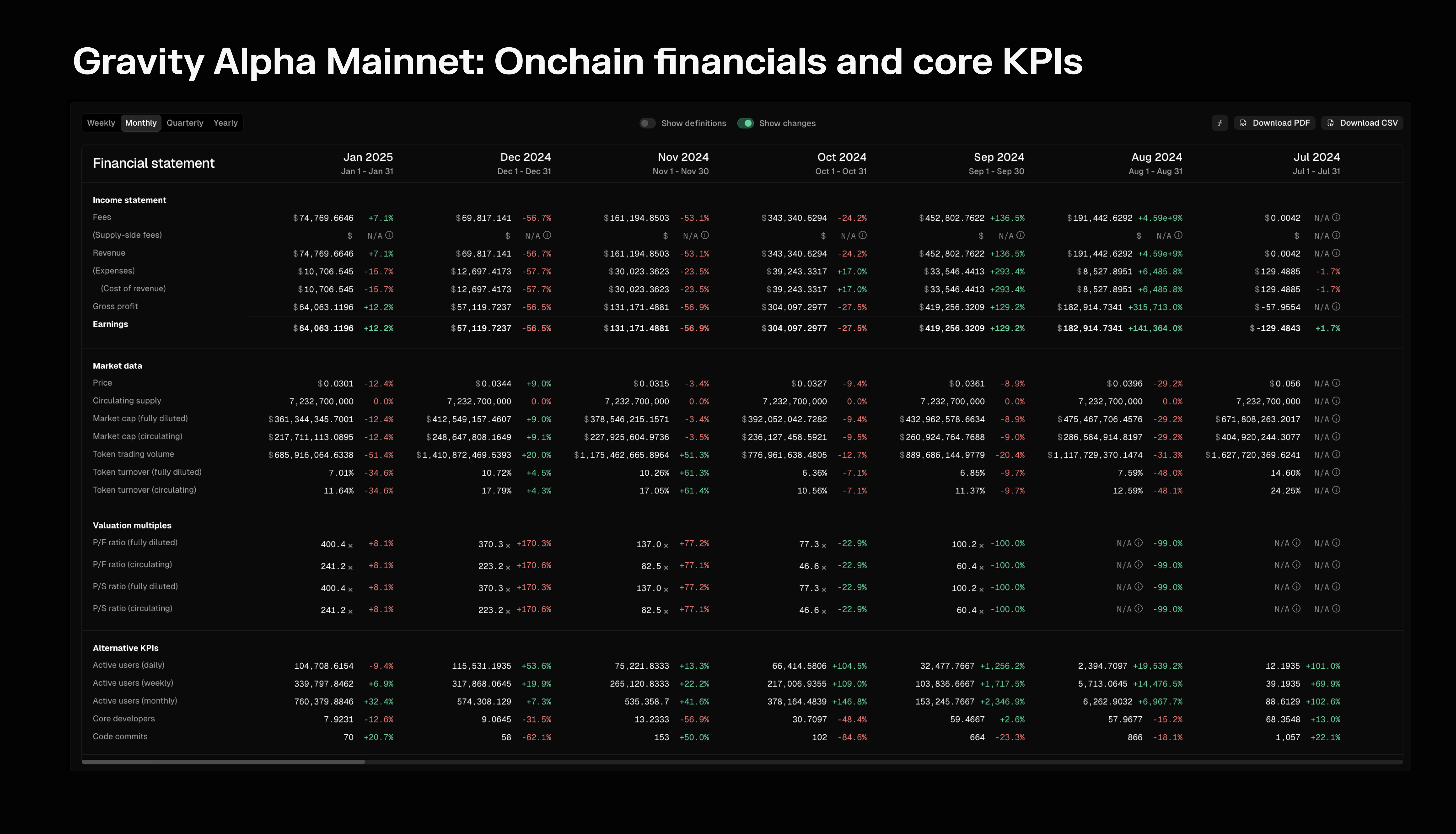 - These dashboards make it easy to understand how Gravity Alpha Mainnet performs on both financial (fees, revenue, token incentives, etc.) and alternative metrics (DAUs, MAUs, user retention, etc.) over time.