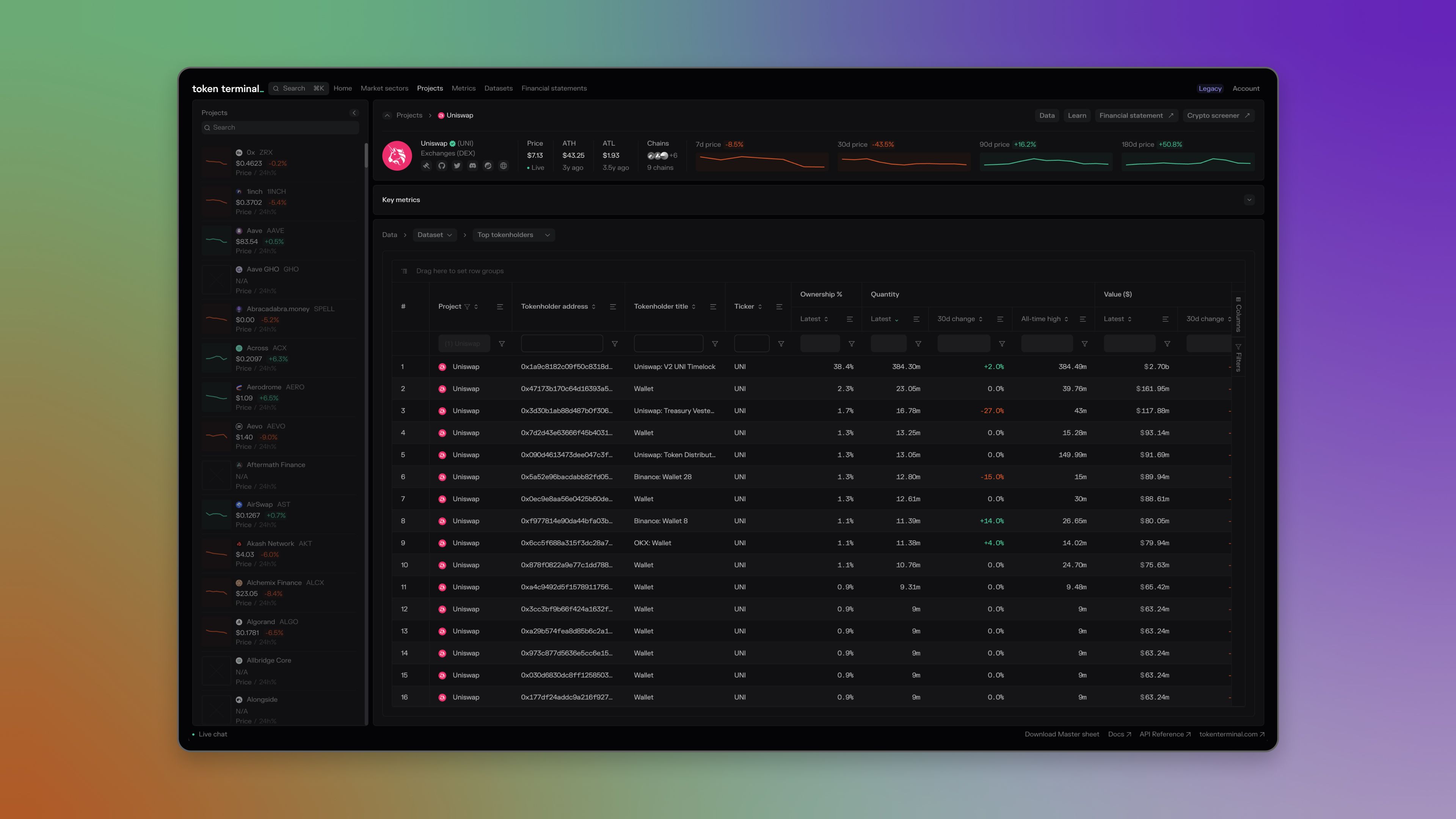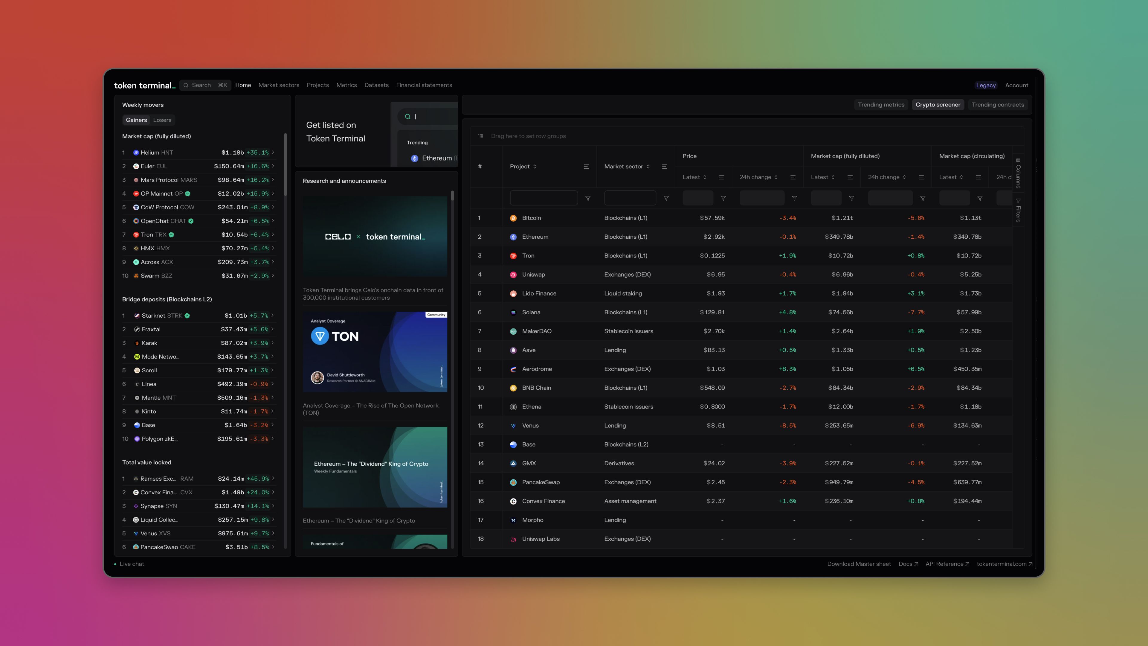One of the most valuable tools on Token Terminal, our Crypto Screener, is now available right on the home page for easier access. The screener is essential for conducting in-depth comparative analysis across hundreds of tokens, allowing you to efficiently identify patterns and outliers. With full datatable functionality, you can rearrange columns, apply filters, and perform rigorous data-driven analysis to quickly assess and react to market movements. Try out the Crypto Screener on the home page today to level up your token research.