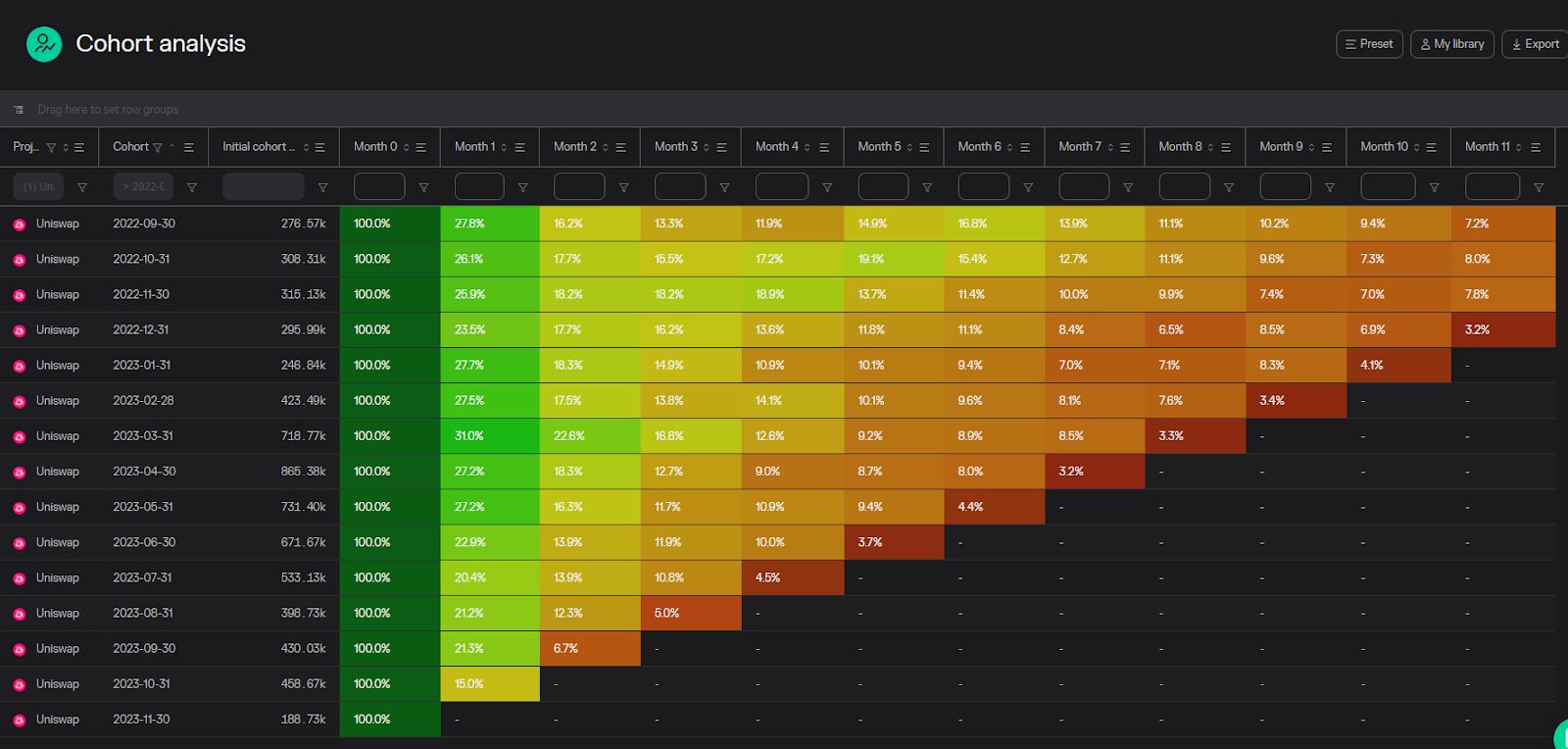 After all, the granularity of data we can observe on crypto networks is unprecedented in finance. To further our point, below are Uniswap’s retention rates for monthly active users:
