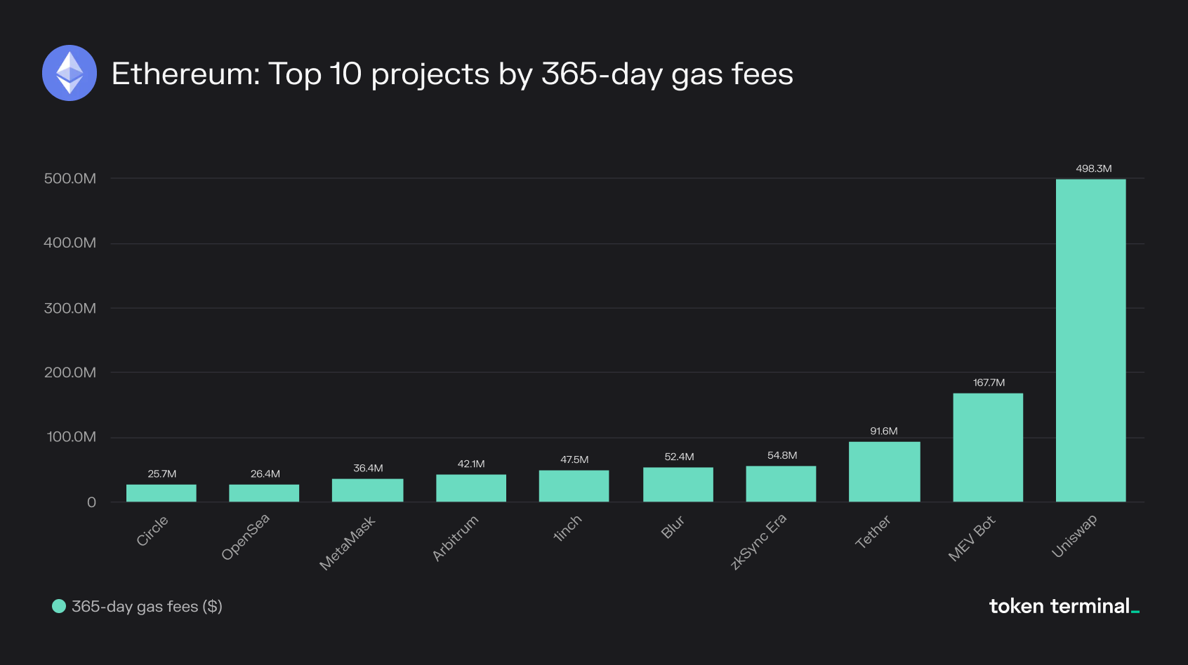 For a more consolidated view, below we have Ethereum’s top 10 projects based on 365-day gas fees over the last year: