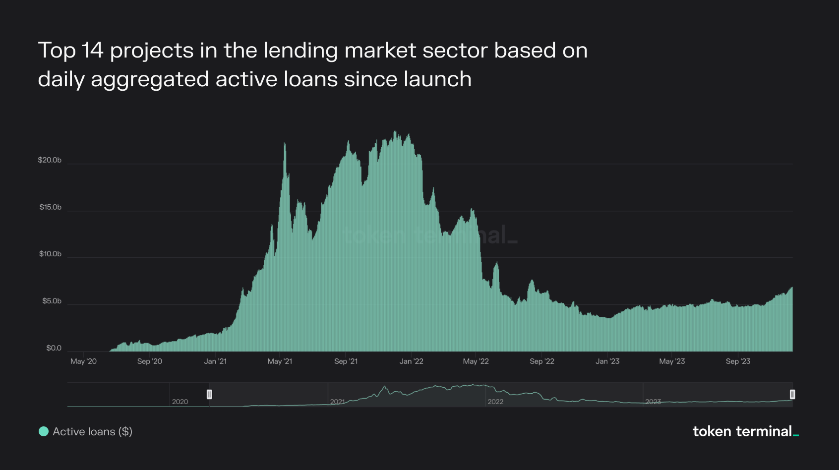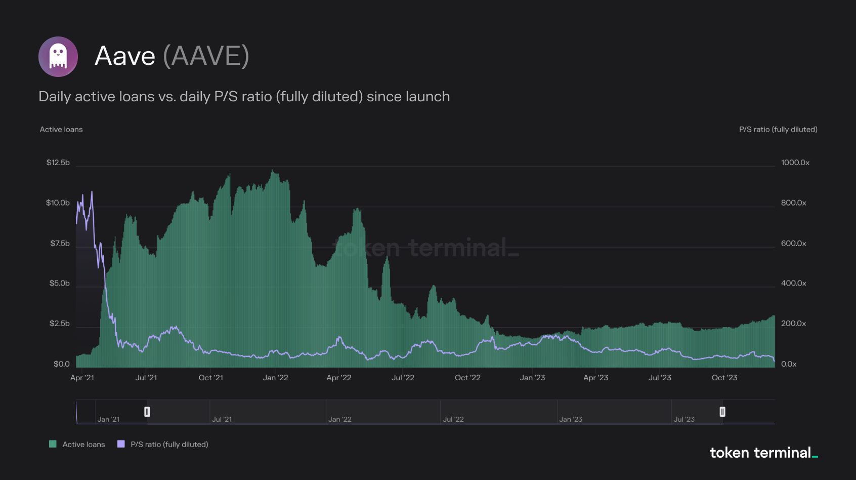 Shifting to lend/borrow protocols — below we have Aave’s active loans vs daily P/S ratio (Price to Sales) since launch.