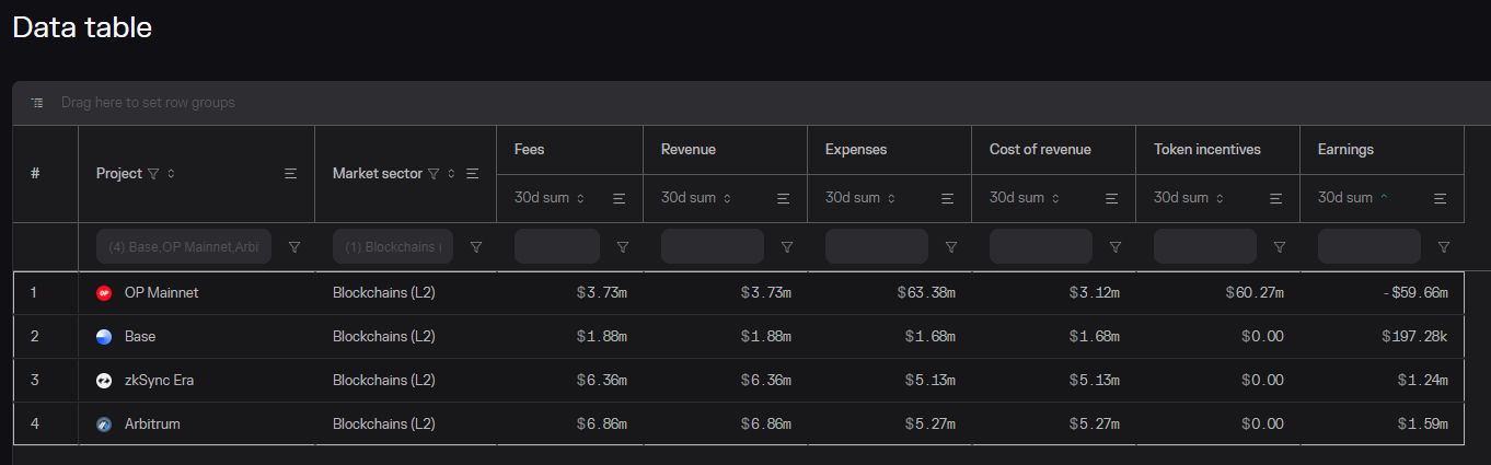We can even do relative comparisons across projects, sectors, blockchains, etc. Below we are looking at the top Ethereum L2s by fees, revenue, expenses, cost of revenue, token incentives, and earnings.