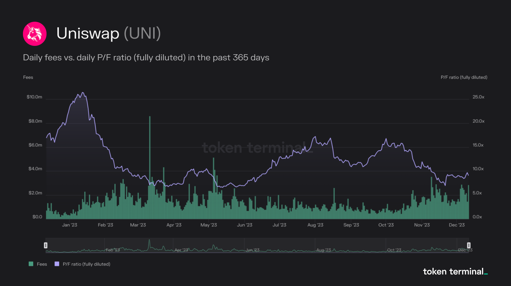 Below we have Uniswap’s fees and P/F ratio (price to annualized fees) over the last year: