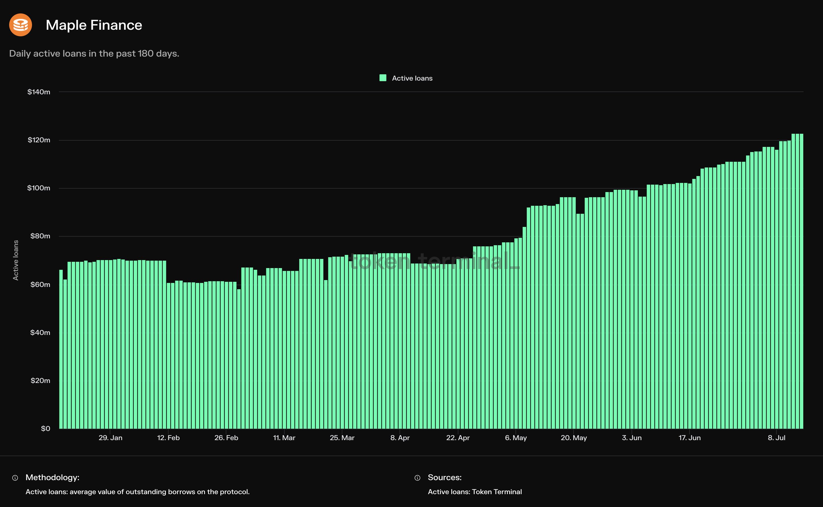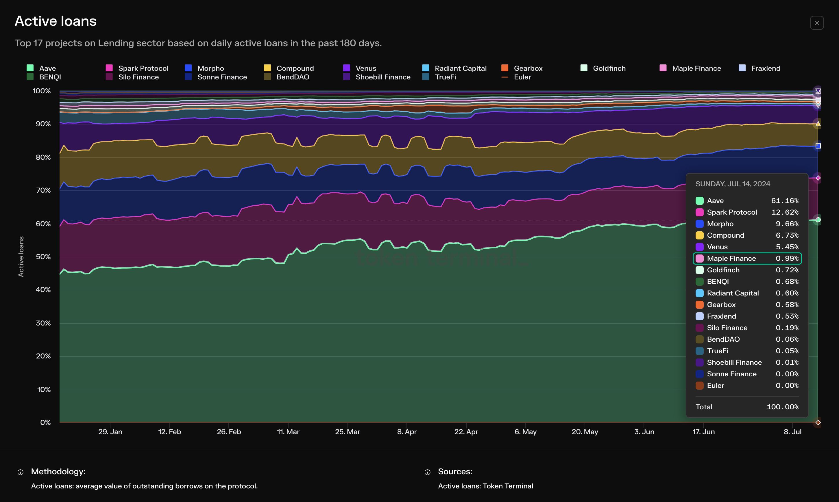 In contrast, Maple Finance’s $119.9M in active loans represents just under 1% of the total active loans among leading protocols.