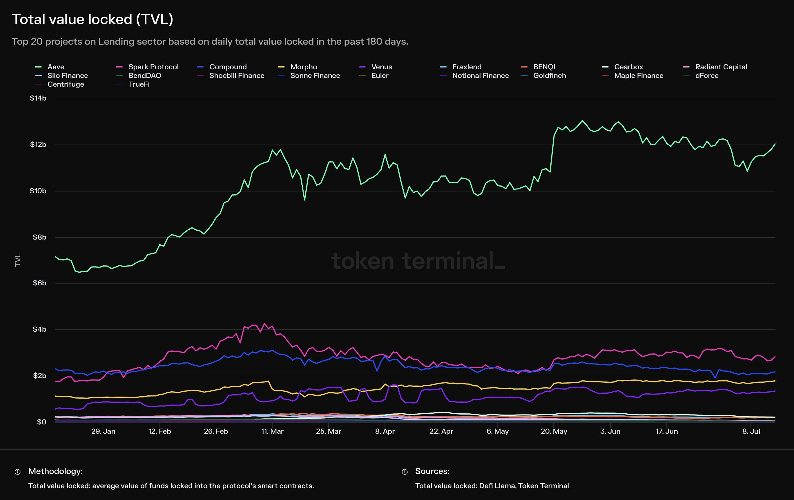 Overall, the DeFi lending market data reflects a confluence of trends: a liquidity moat around the largest lending protocol, stagnation or decline in TVL for protocols with a similar offering, and the early signs of interest in onchain credit from tier-1 institutional borrowers.