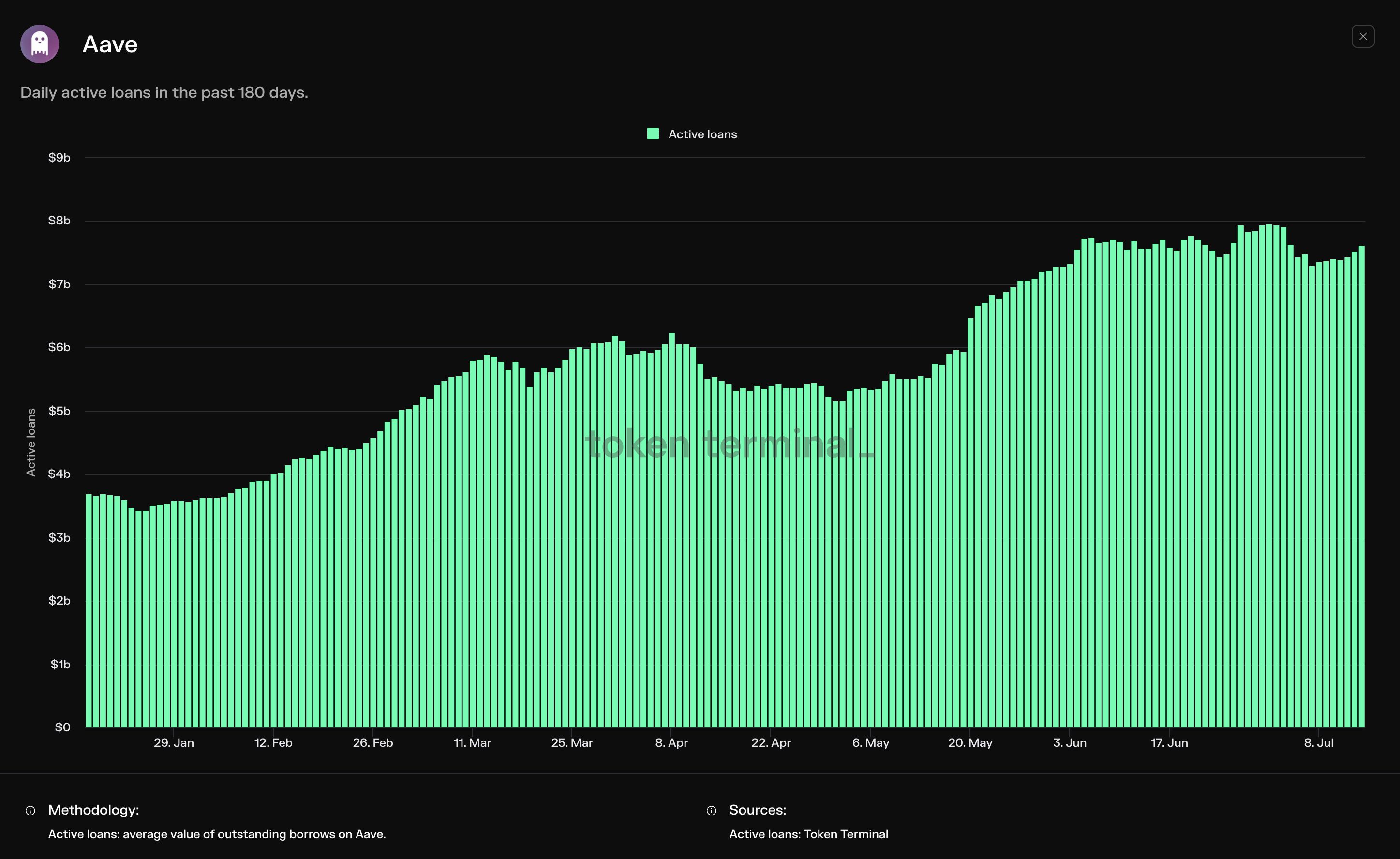 While Aave’s active loans (visualized below) grew 2x over the last six months, many of its closest competitors have only experienced mild growth or declined precipitously.