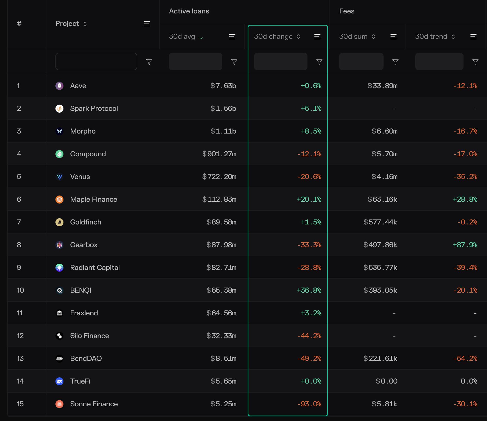 To illustrate further, seven of the twenty largest lending protocols experienced double-digit percent declines in active loans over the last 30 days.