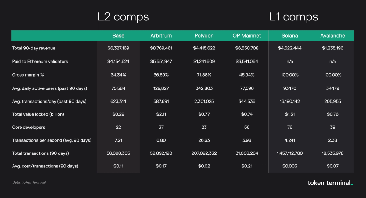 Note that Base was launched to the public on 8/9/23 — therefore, our comps are on a 90-day basis. A quick rundown as to how Base is stacking up against its main competition:
