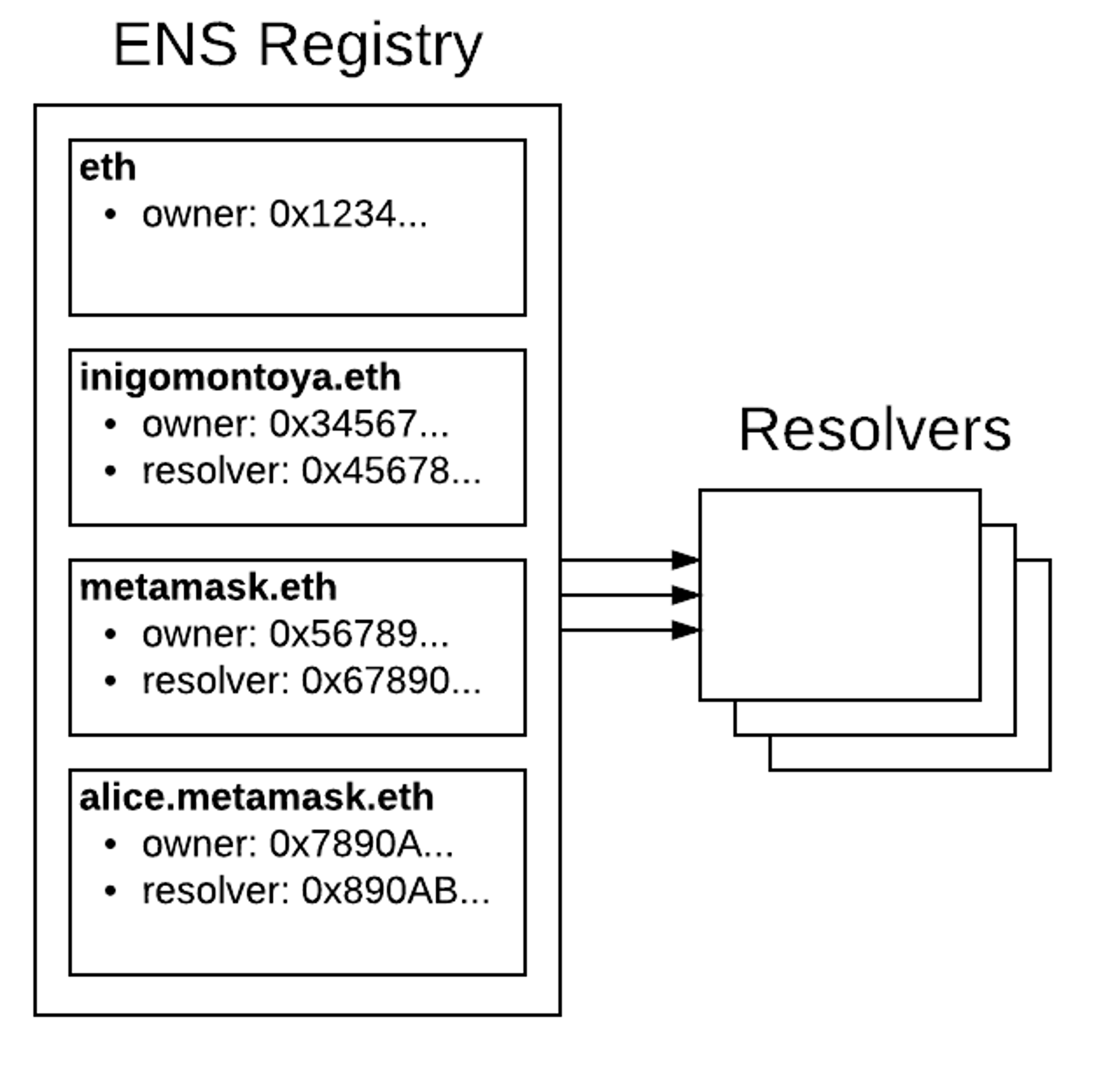 At the technical level, the ENS protocol consists of two main components: the ENS registry and resolvers.