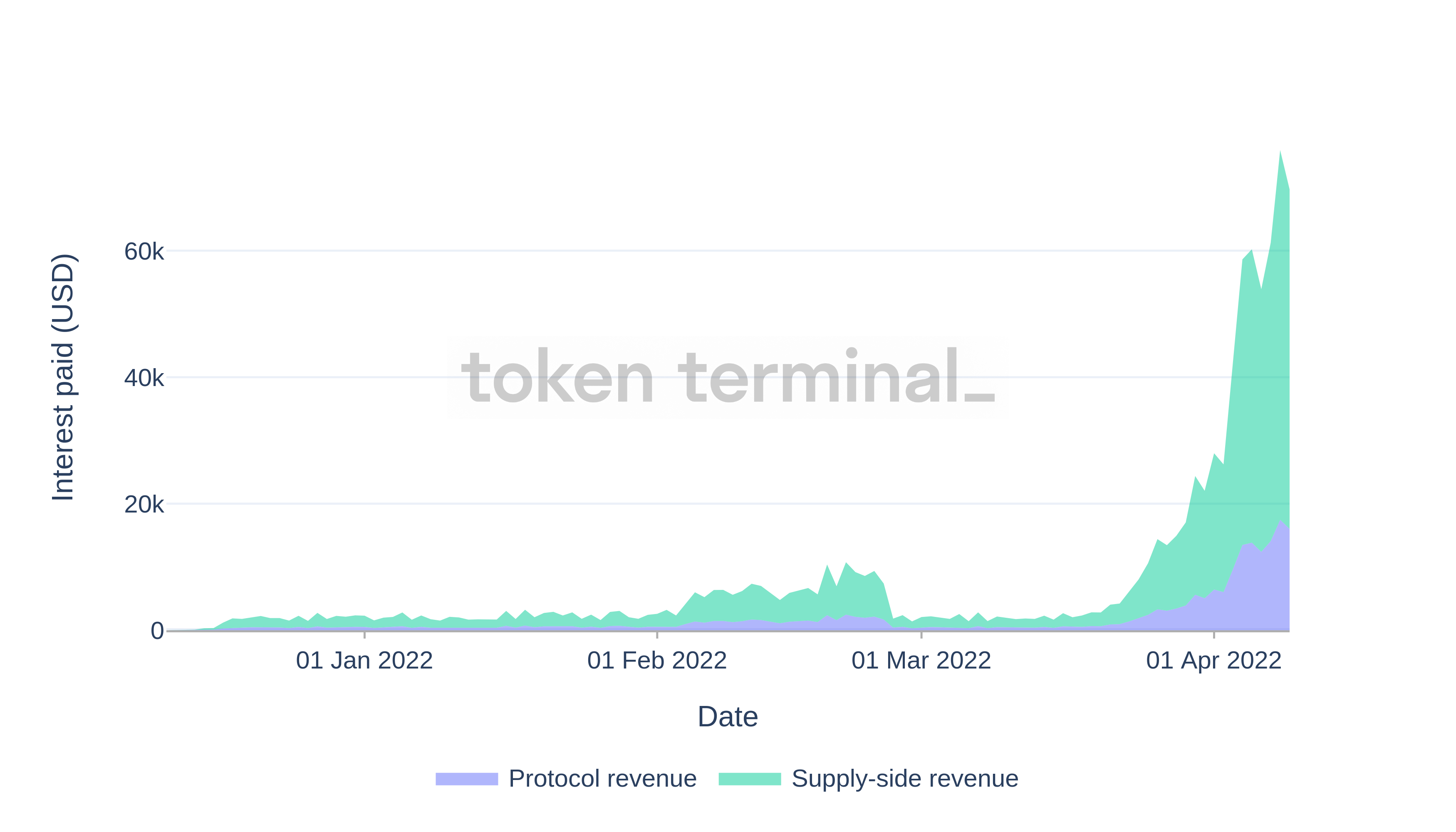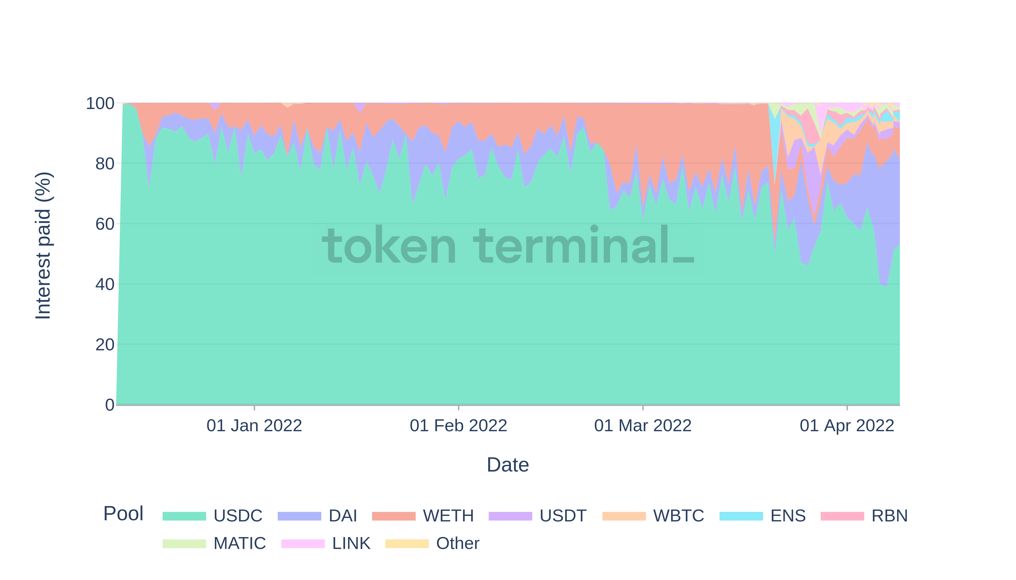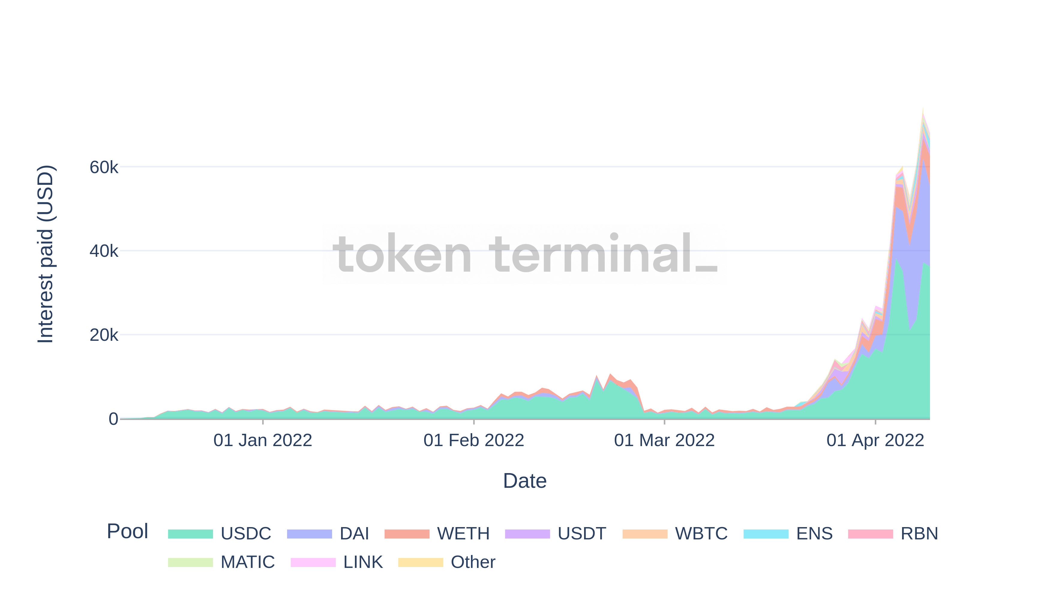 The interest rates are automatically adjusted and vary over time and across pools, so the borrowing volume alone is not enough to know how much revenue is being generated. Let’s look at how much interest the borrowers are paying, shown in the figure below.