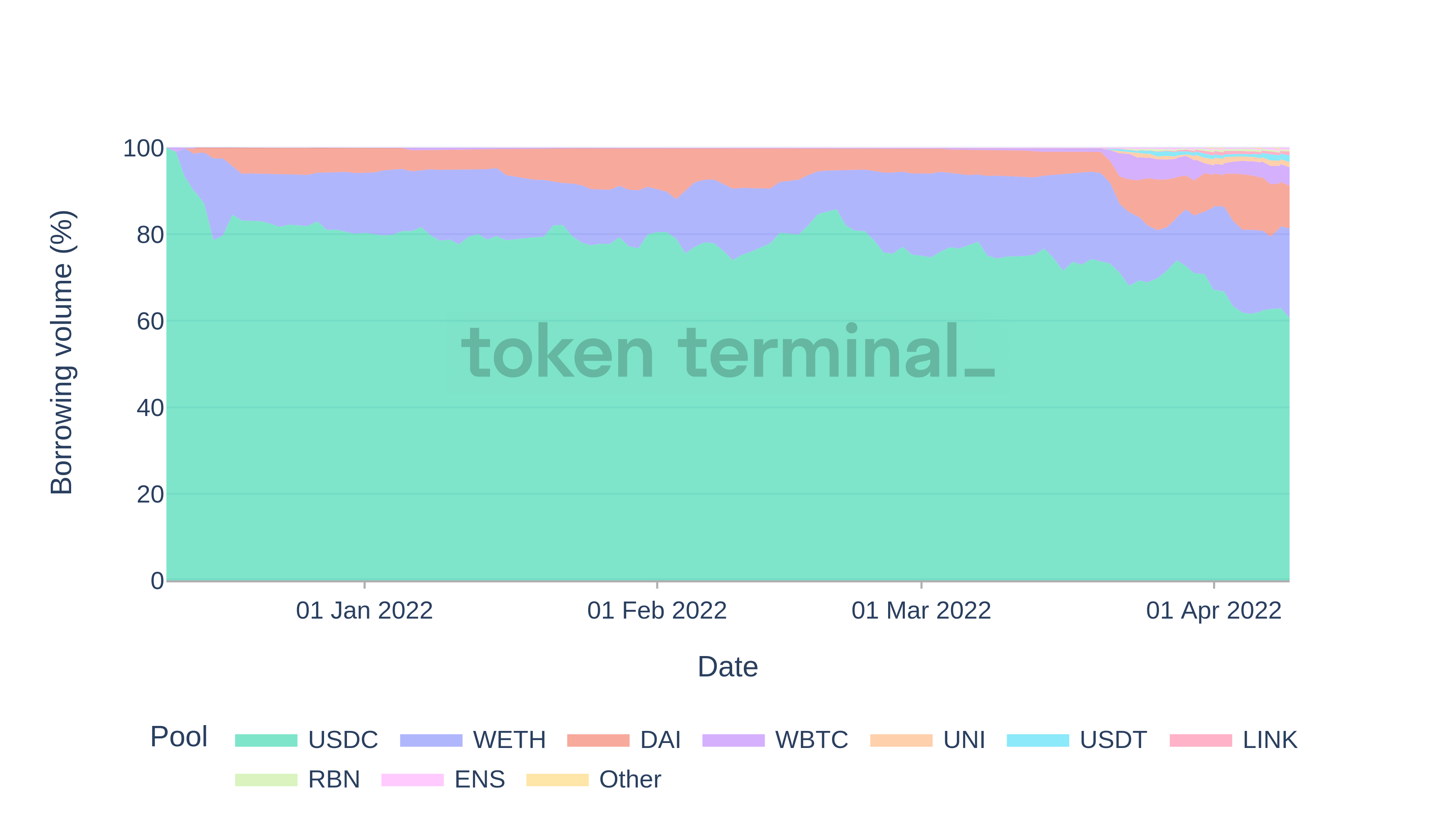 The most borrowed token is USDC, followed by WETH, DAI, and others. To understand how relative borrowing volumes have developed over time, it helps to look at the the borrowing volume of each asset as a percentage of the total borrowing volume, shown in the figure below.