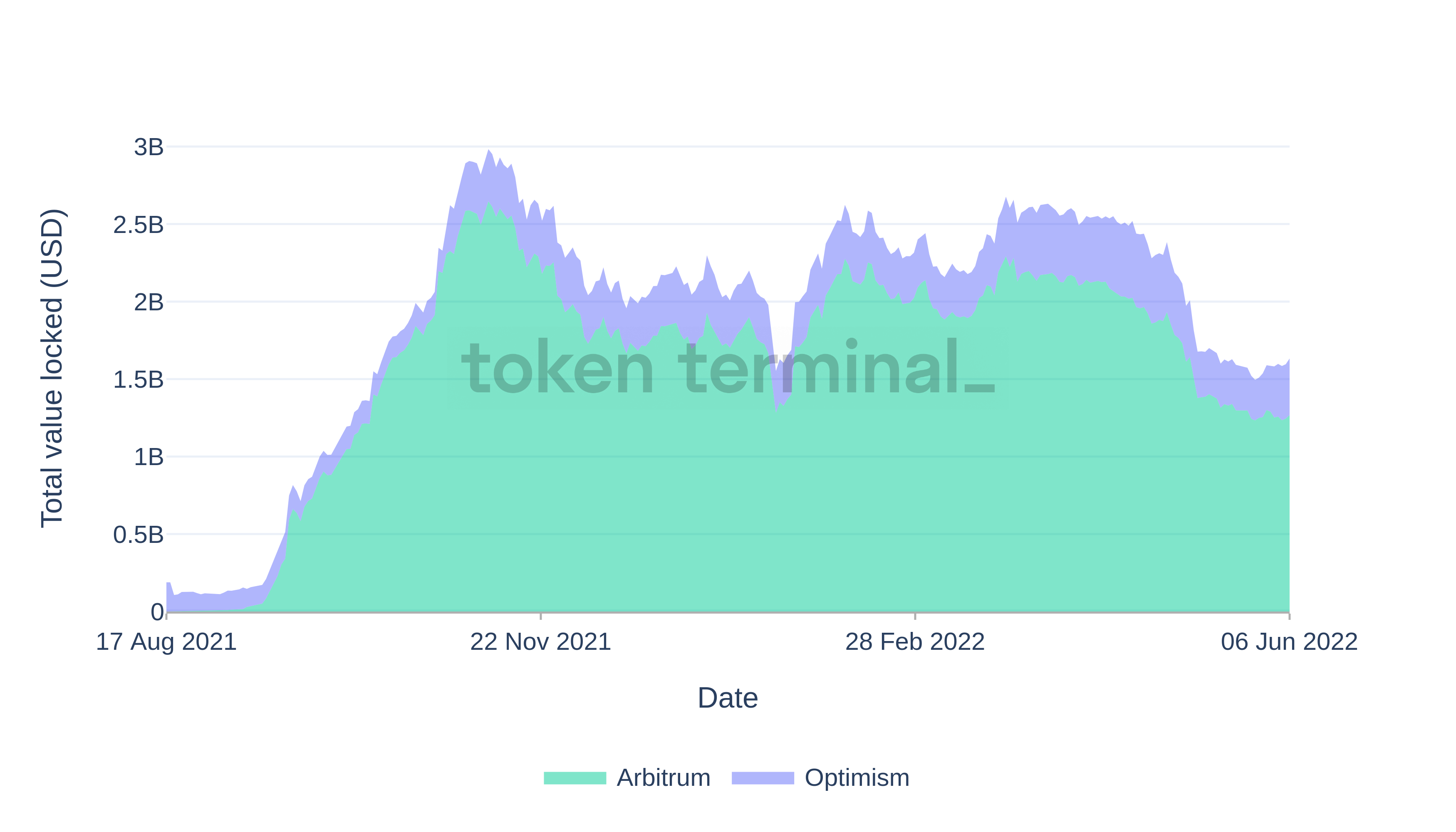 In the short term, Optimism’s closest competitor is Arbitrum. Like Optimism, Arbitrum is an optimistic rollup designed to scale Ethereum. Currently, Arbitrum is significantly larger than Optimism when measured by total value locked (TVL), i.e., the value of assets on the blockchains.