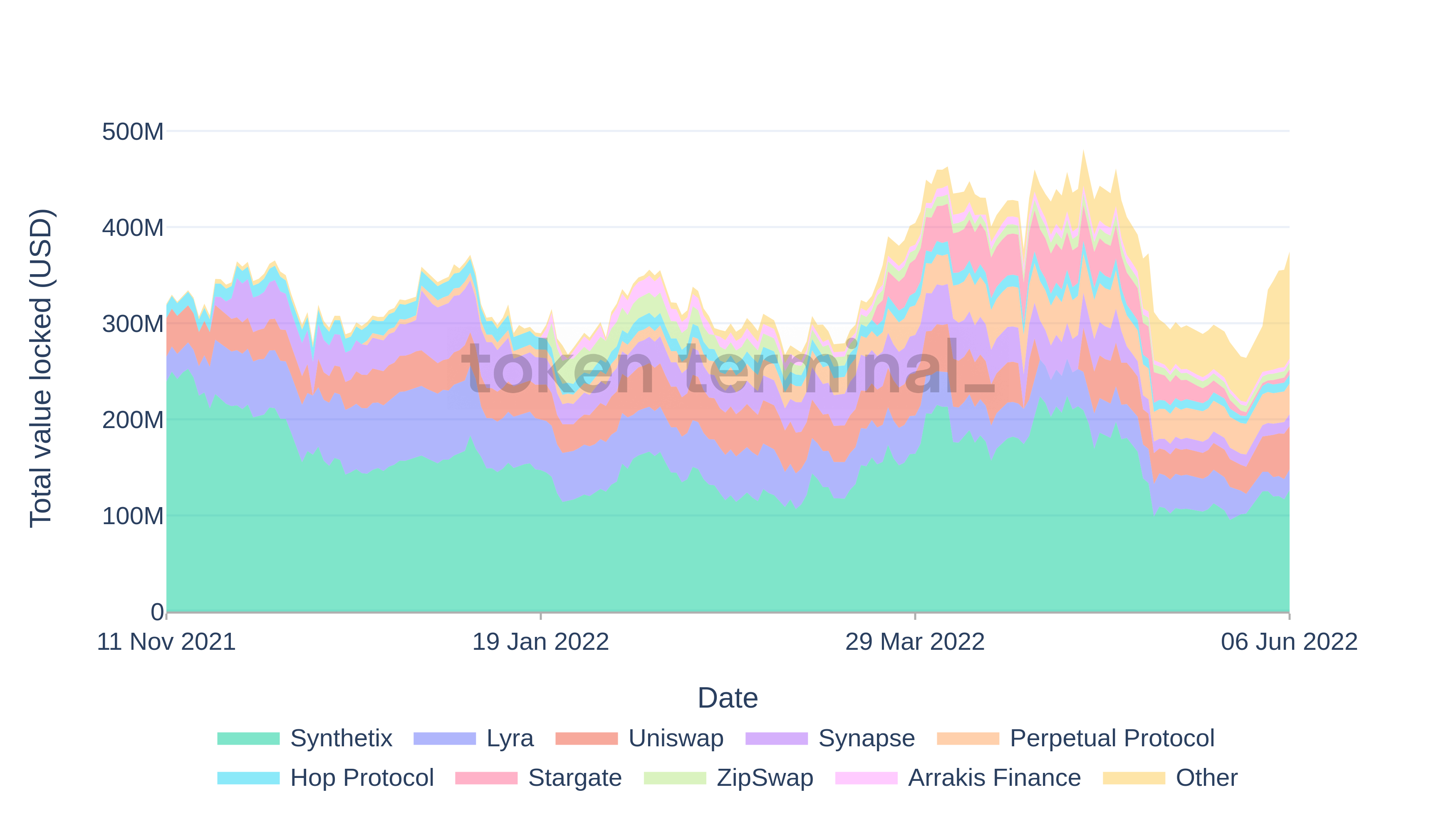 Optimism’s success ultimately depends on the success of the dapps running on it. The figure below shows the total value locked of the largest dapps on Optimism. Although TVL has not grown recently as we are in a bear market, the DeFi ecosystem has diversified significantly as more dapps have been launched.