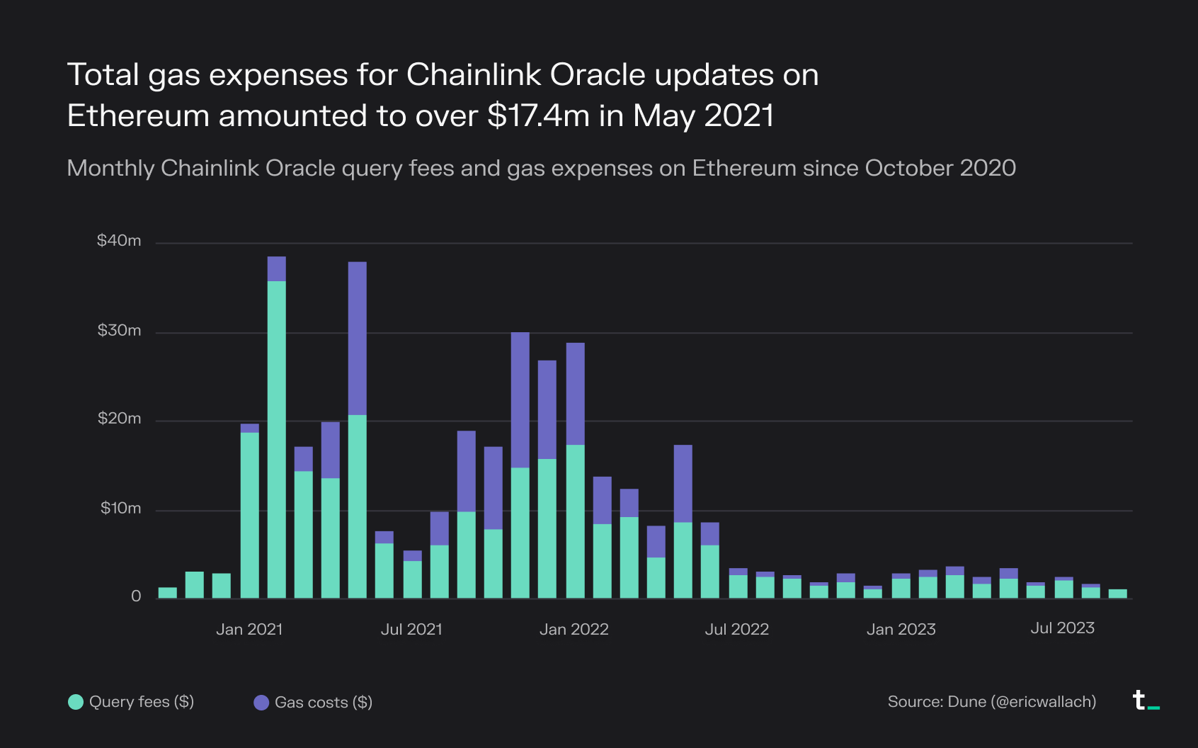 As an example, in May 2021, $17.4m and $20.5m were paid in gas and query fees for Chainlink (a major Oracle service) price feeds on Ethereum, respectively. 46% of the total fees paid by Chainlink users on Ethereum were used for gas payments. [2]