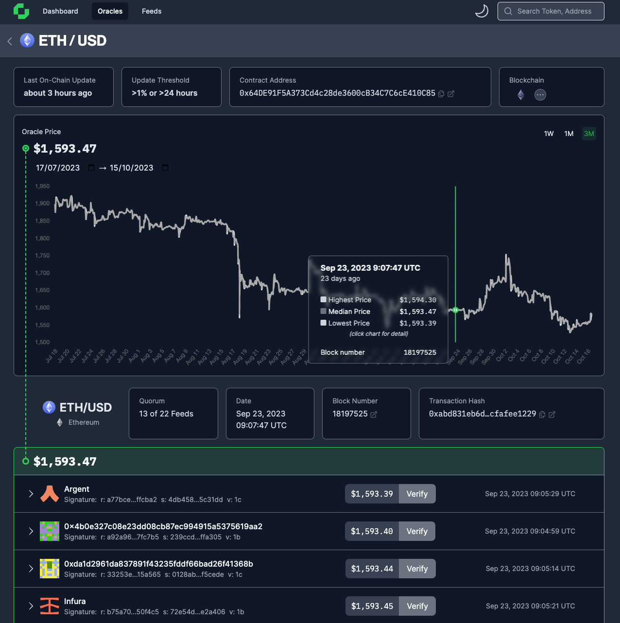 - Transparent. All historical data provided by Chronicle is verifiable end-to-end via Chronicle’s public Oracle dashboard. [13] The dashboard also enables tracing Oracle prices down to its individual Validator prices, which can then be further broken down into queries of raw data sources like Coinbase or Binance.