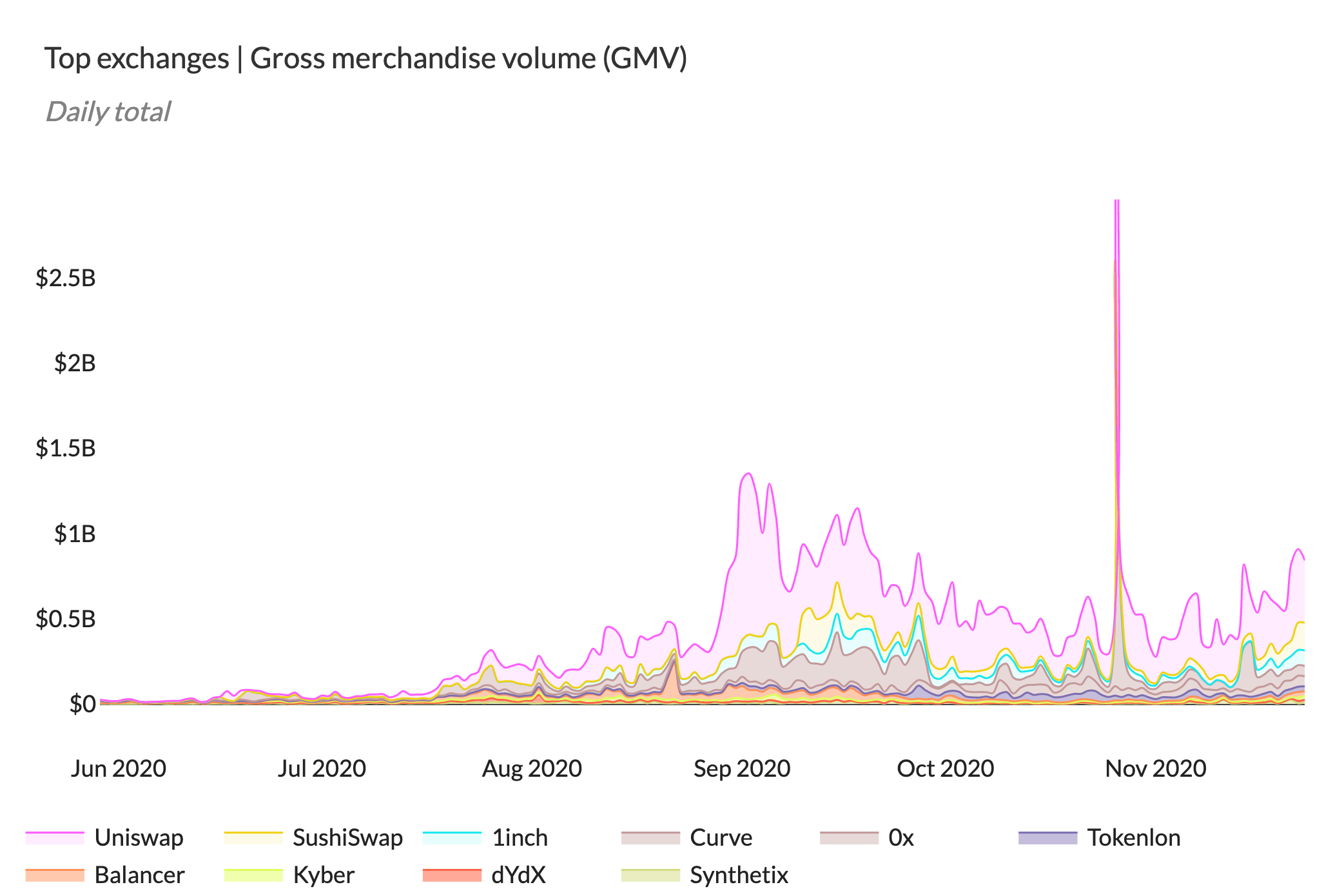 - AMMs dominate DEX trading volumes, with Uniswap and Sushiswap in the lead.