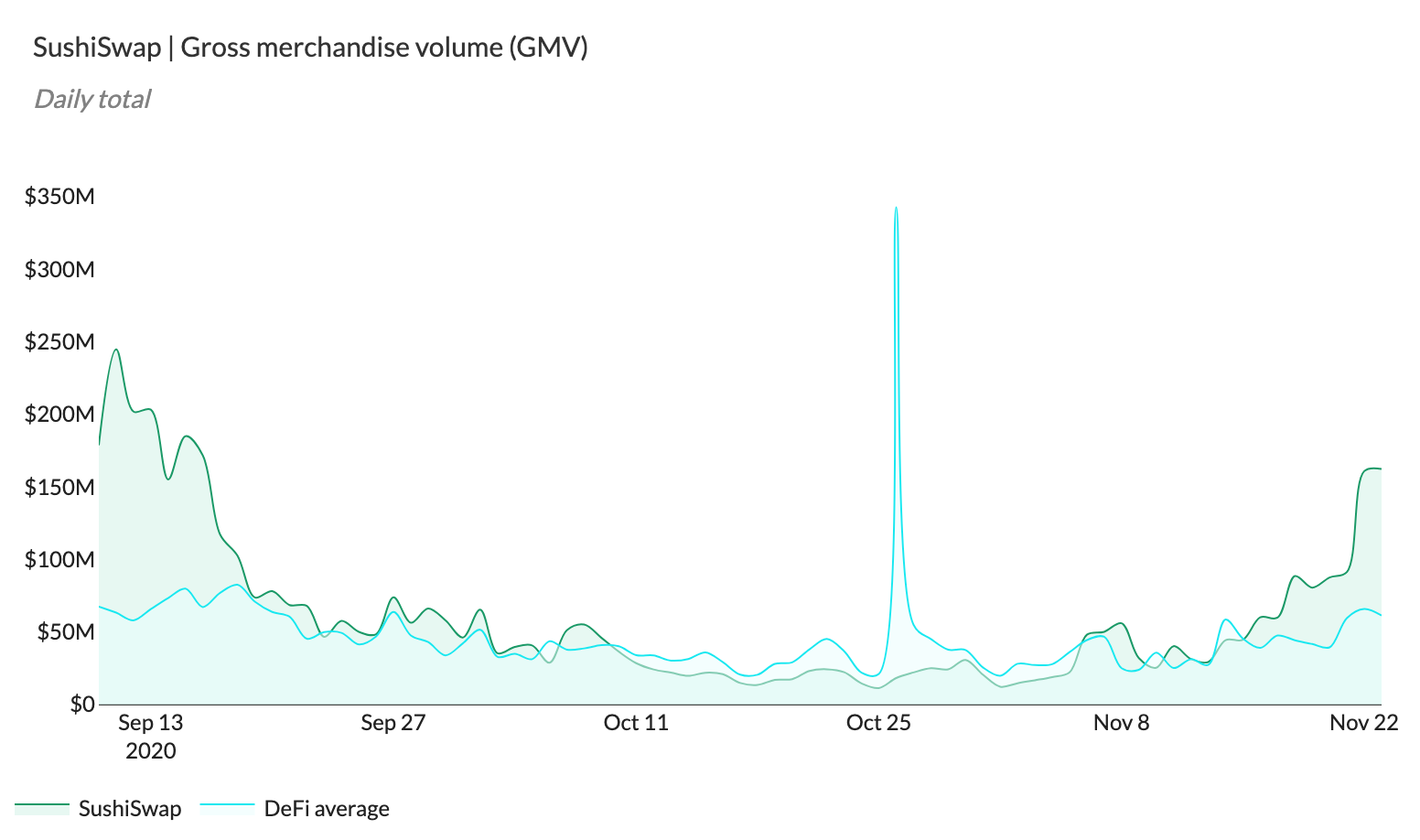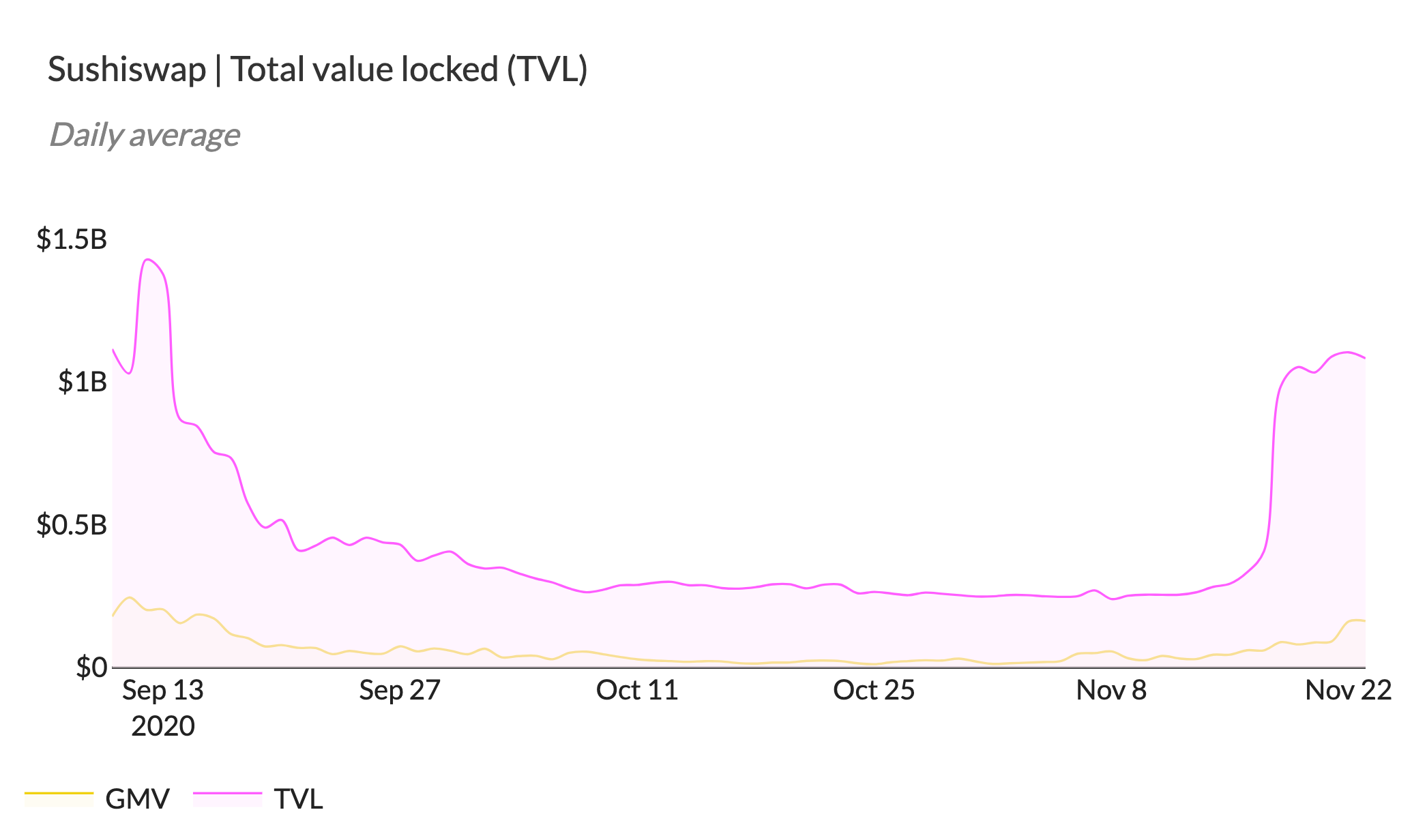 - Sushiswap’s trading volume (GMV) has increased steadily over time, but does not seem to directly correlate with the increase in its TVL.