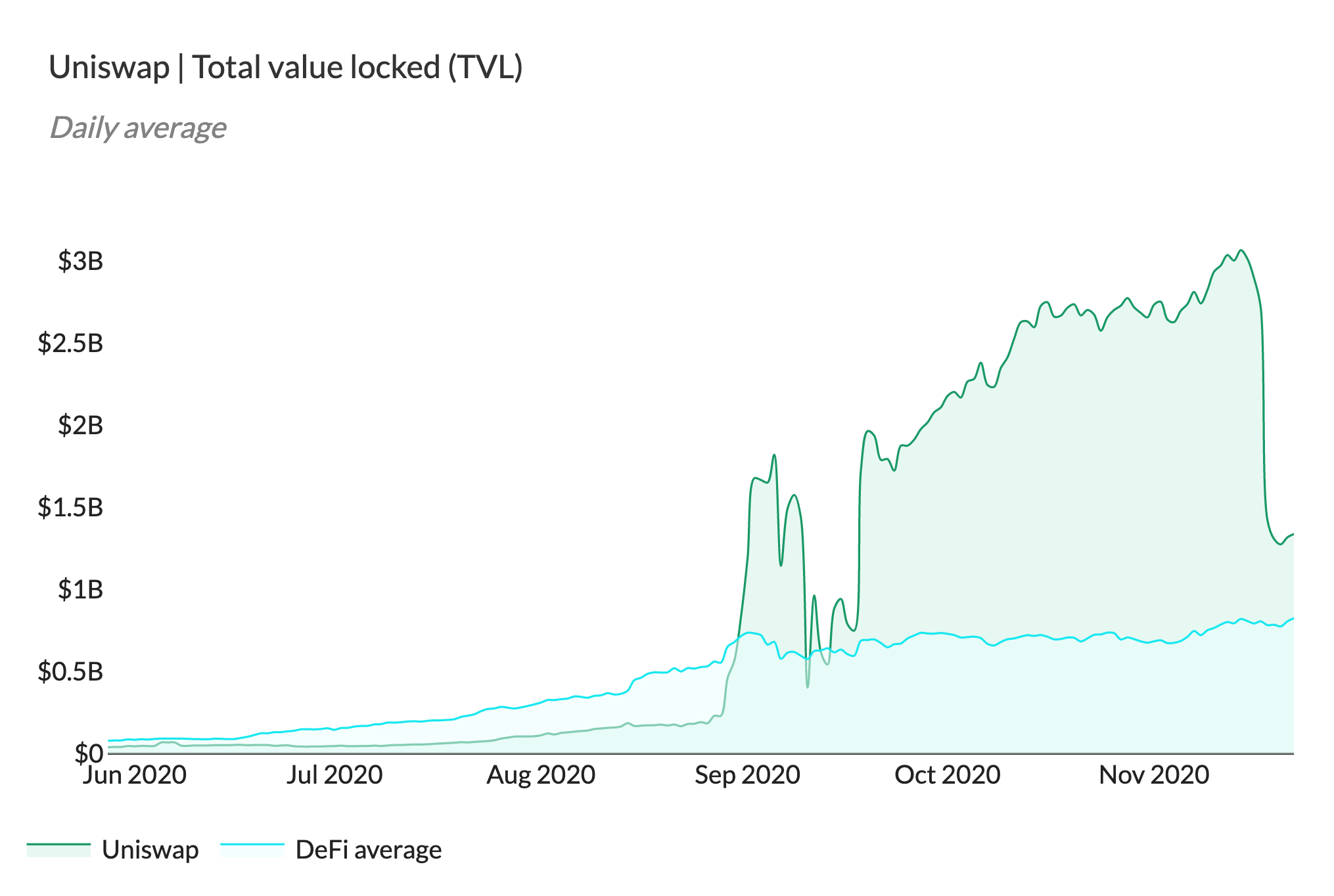 - Uniswap’s TVL dropped ~50% on November 17th when the protocol’s token incentive program ended.
