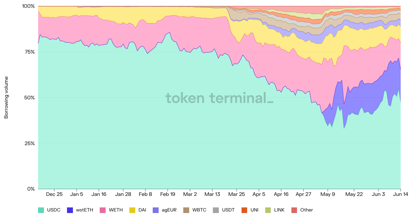 Q: The composition of your borrowing volume is similar to what we'd see on other lending protocols like Compound and Aave, where stablecoins and wETH make up the bulk of it. What are your thoughts on the similarity here and are you seeing demand for lending and borrowing the long tail of crypto assets?
