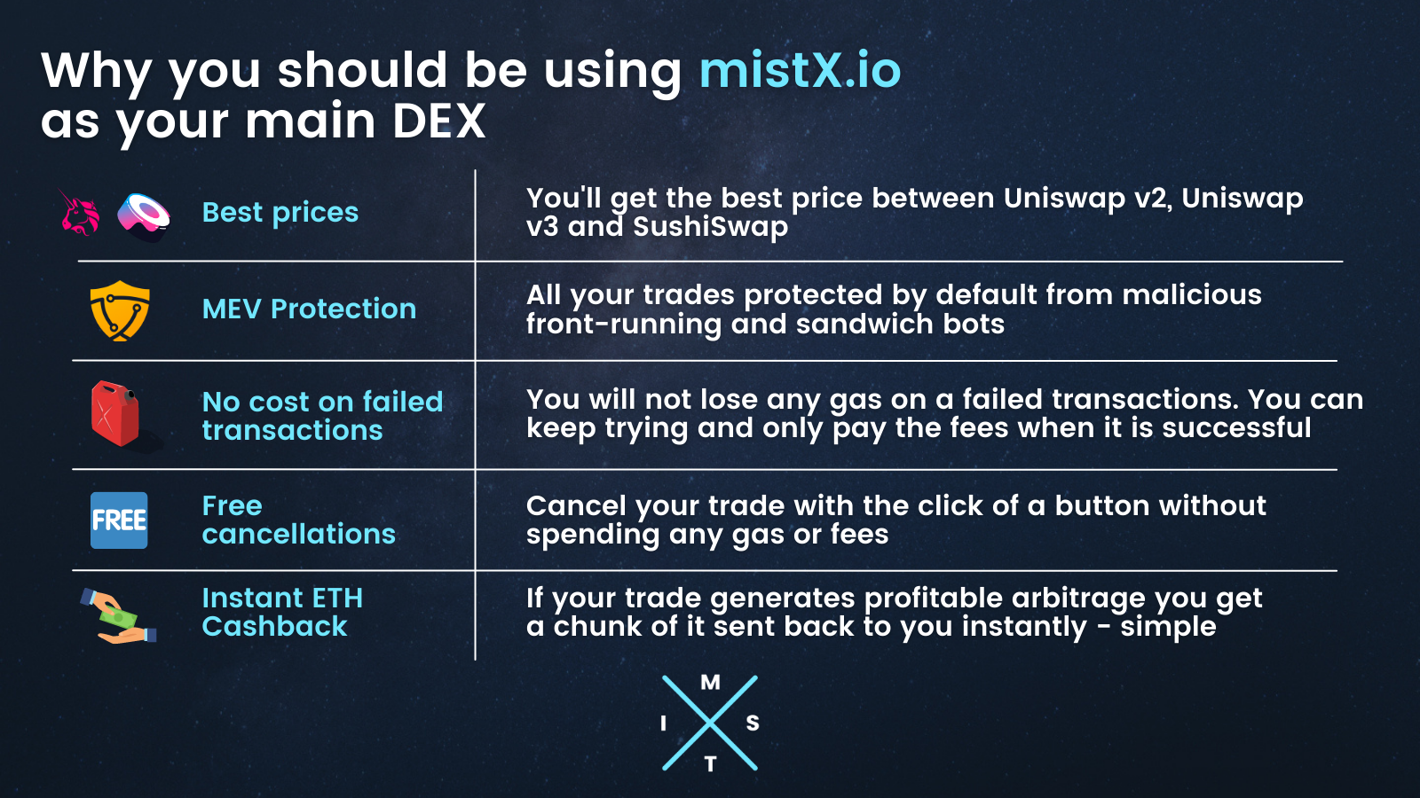mistX is a DEX that allows users to swap on Ethereum with MEV/front-running protection and benefit from other key features such as instant ETH cashback, no cost on failed transactions, and free cancellations. One area the team focuses their efforts on is the user experience - from landing all the way to executing a trade. Instead of just using the same interface many out there use the team really crafted a unique design with an intuitive user-first approach.