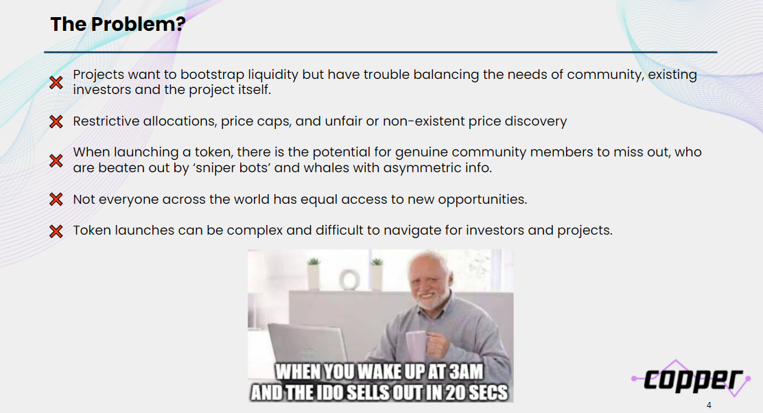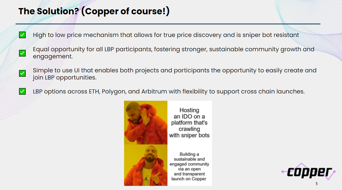 Copper is a platform built on top of Balancer Liquidity Bootstrapping Pools (LBP) that allows projects to generate liquidity fairly, transparently, and with no middlemen or gatekeepers.