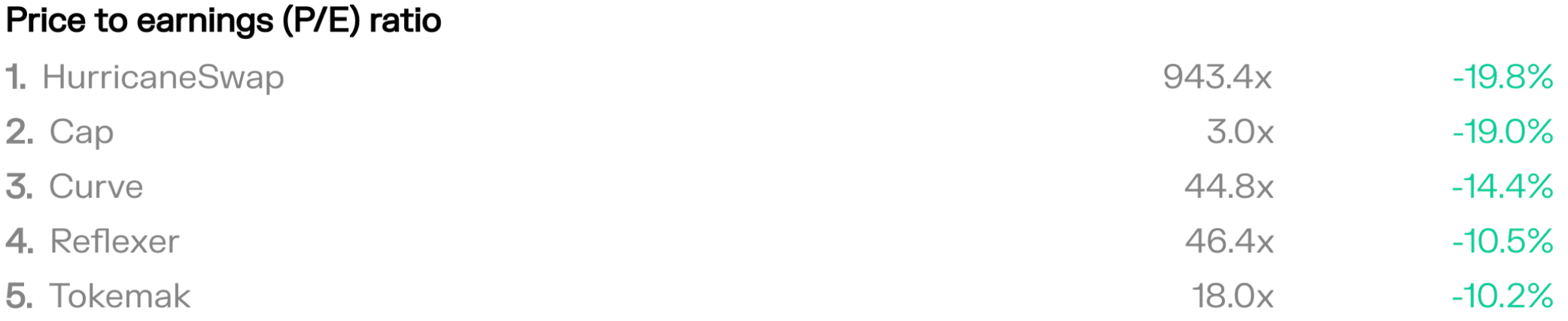 Top projects by latest P/E ratio