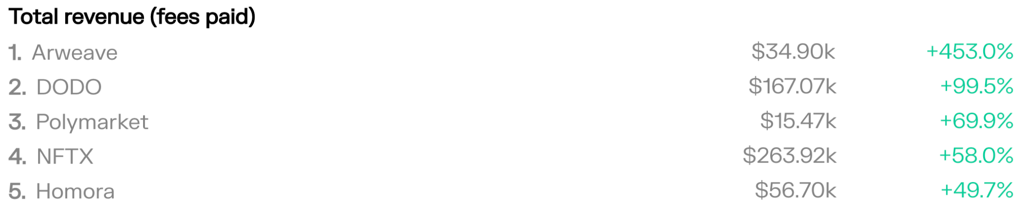 *Note: We have excluded dapps & blockchains with revenue figures under $10k/week.**Note:‘change’ is calculated as a snapshot comparison, whereas ‘trend’ is calculated by comparing the given time interval against its previous time interval.