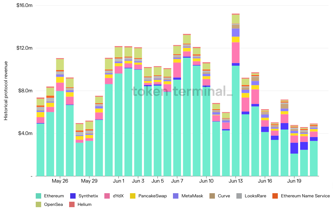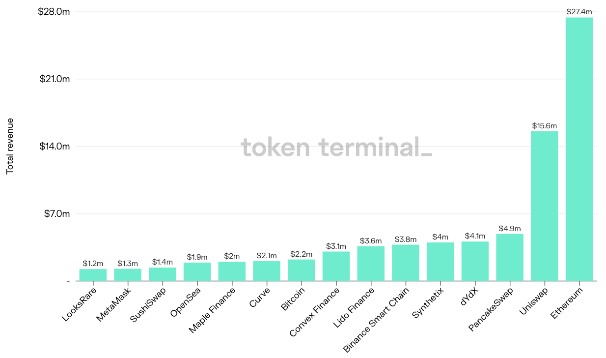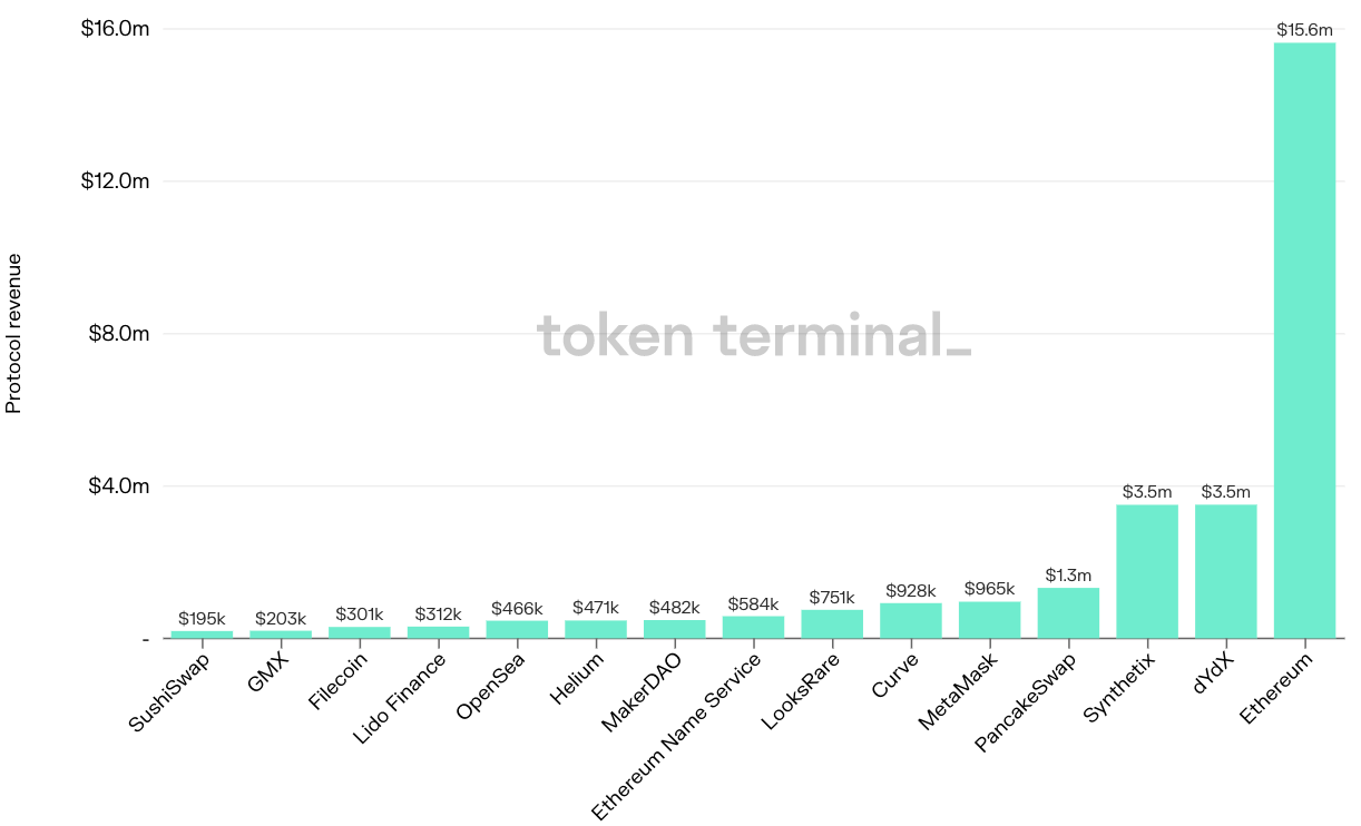 - As is the case with total revenue, Ethereum is also in a league of its own in terms of aggregate protocol revenue — by an even larger margin.