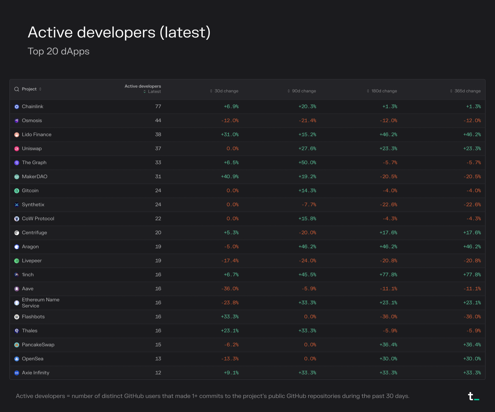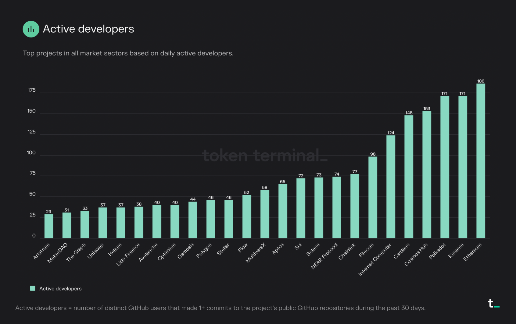 Active developers = number of distinct GitHub users that made 1+ commits to the project's public GitHub repositories during the past 30 days.