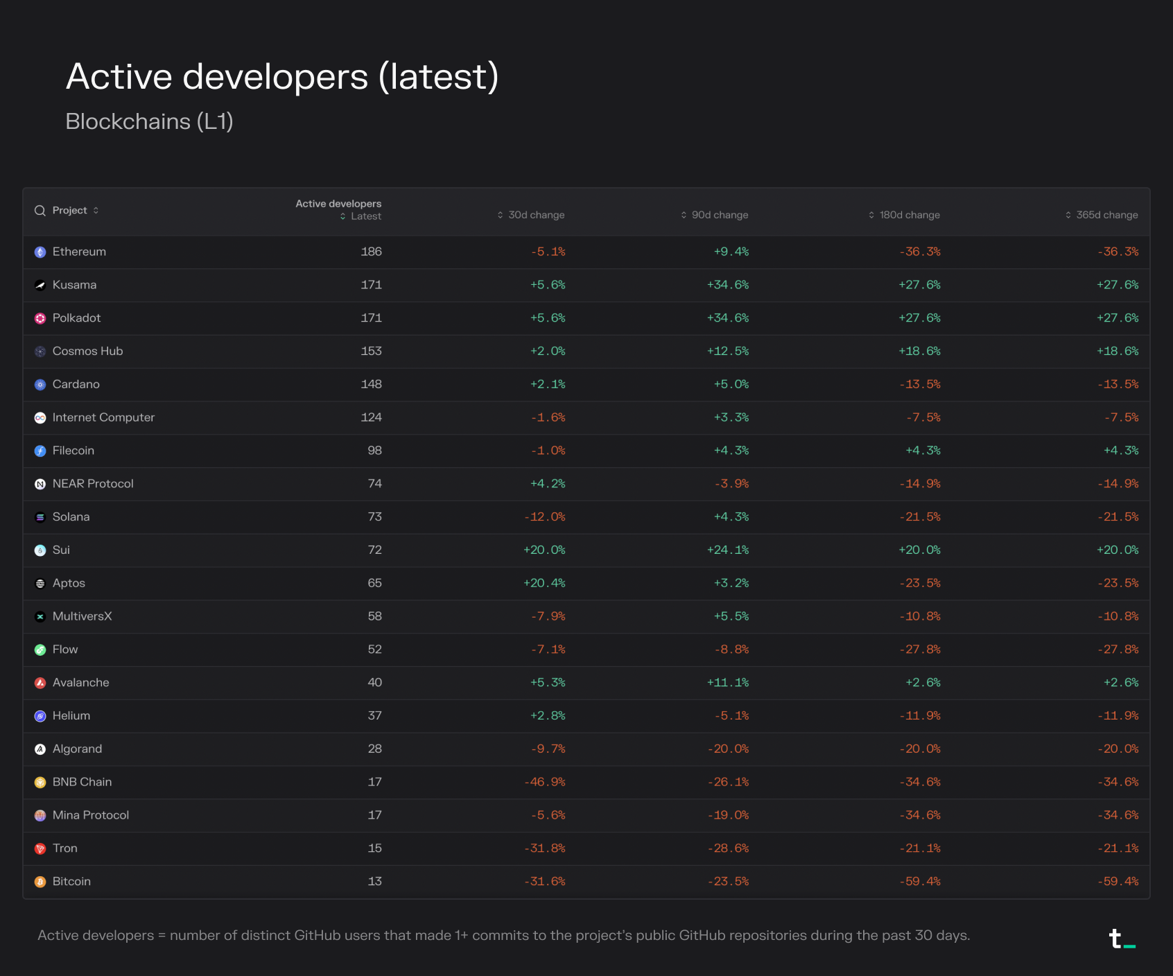- Please note that the active developer number does not account for ecosystem devs – only the amount of developers working on the chain itself.