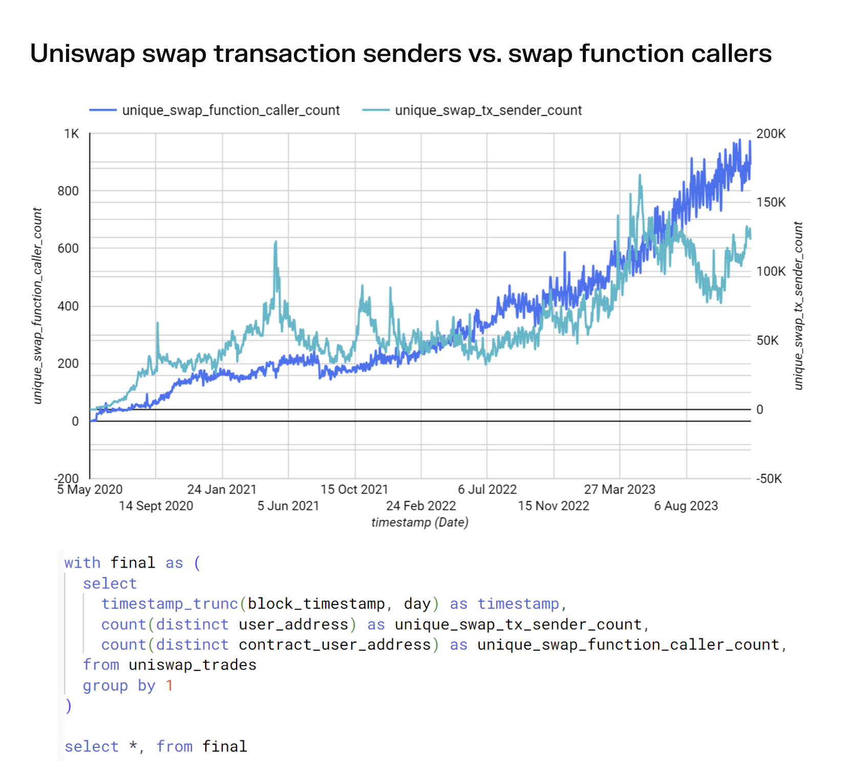 Comparison between unique swap transaction senders and unique swap function caller counts for Uniswap (v2/v3). Transaction senders are a proxy for traders and swap callers represent addresses that interact directly with the smart contracts.