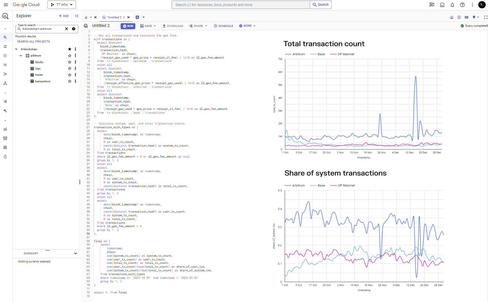 OP Mainnet and Base share a similar architecture and exhibit a similar volume of system transactions. The main reason contributing to a higher proportion of system transactions in Arbitrum is attributed to its shorter block times. System transactions occur with every new block. In Q4, the average block time for Arbitrum was approximately 270ms, whereas for both OP Mainnet and Base, the block times have been set to 2s.