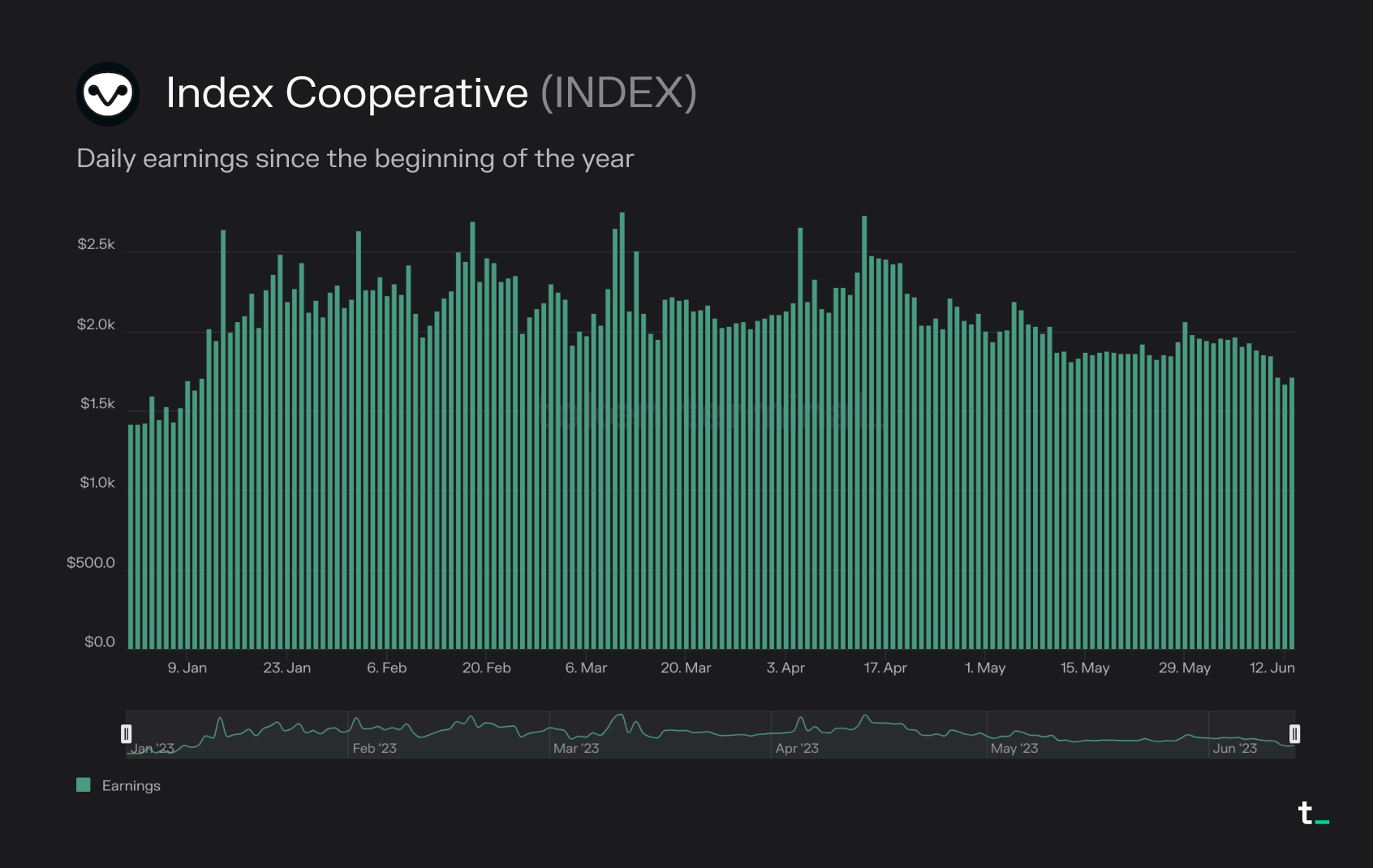 - Index Cooperative has sustained profitability, with daily earnings averaging over $2000 year to date. It's important to note that this figure only includes revenues and token incentives while excluding all other operational expenses. Nevertheless, it's encouraging to see that Index Cooperative has successfully established a cash-flow-generating business that consistently yields returns, even in the volatile and challenging crypto landscape.