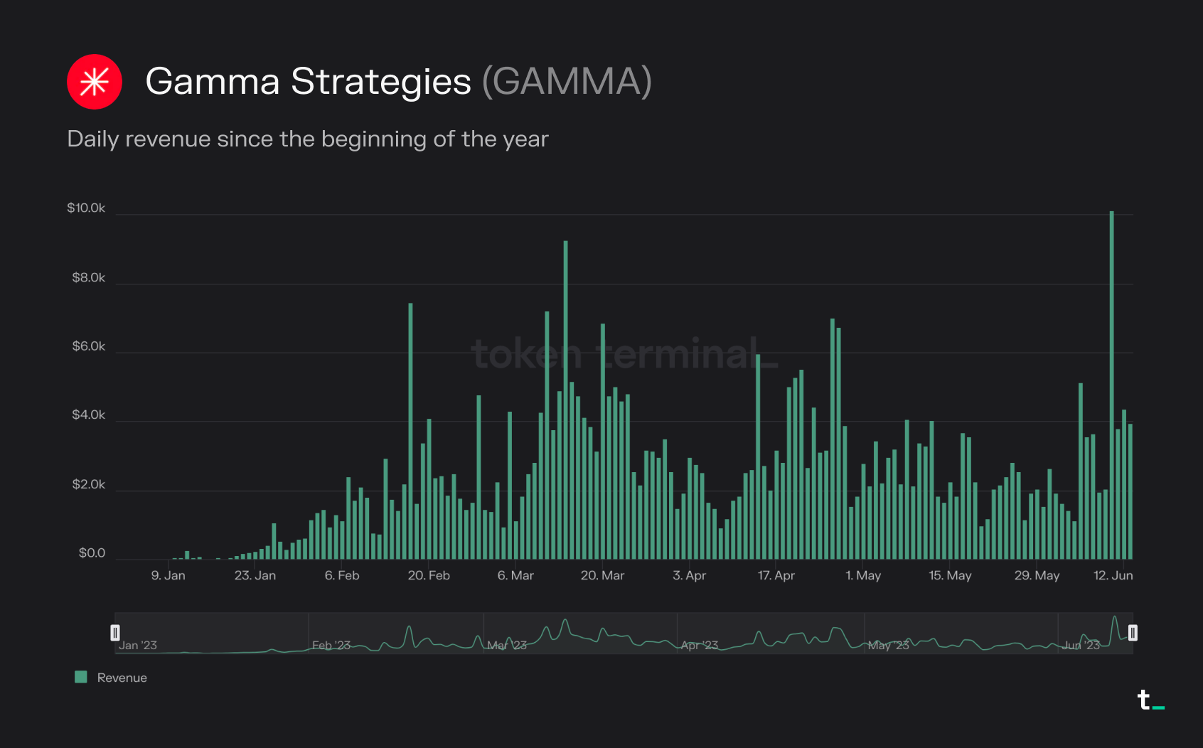 - In February, Gamma Strategies announced an integration with QuickSwap, a move that spurred an increase in both TVL and revenue generated. Alongside the integration, QuickSwap rolled out dQUICK and MATIC rewards to various Gamma pools to incentivize usage. At present, Gamma is generating between $1000 and $3000 in daily revenue, with occasional days of higher spikes.