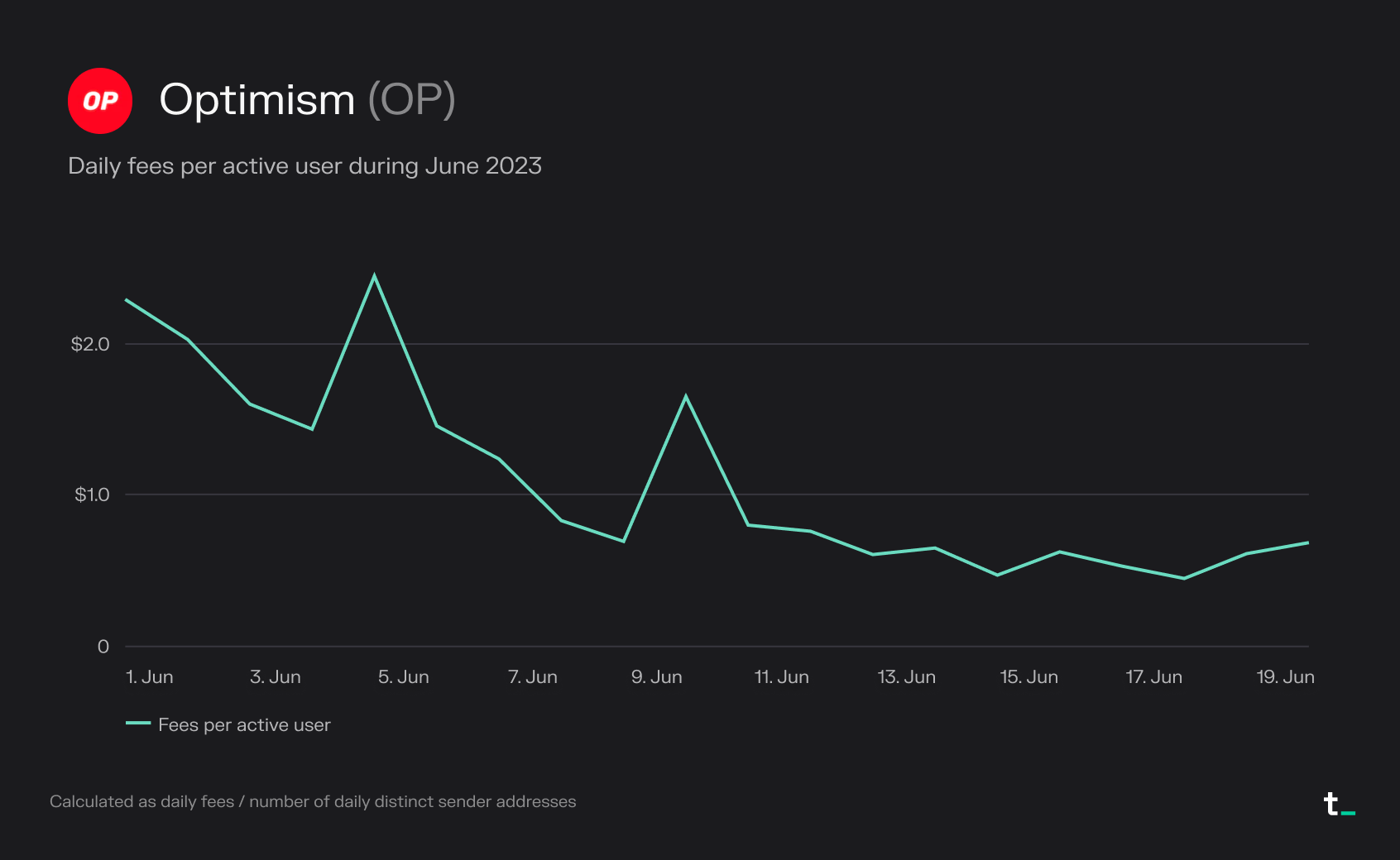 - Following a recent significant protocol upgrade, fees on Optimism are decreasing even amidst a surge in user activity. Optimism’s Bedrock Upgrade, which was completed on June 6th, 2023, is a chain update designed to optimize gas usage, deposit times, and node performance, among other enhancements. Notably, the daily fees paid per active user were 70% lower on June 20th, just two weeks after the upgrade, compared to those on June 5th, a day before the upgrade was implemented.